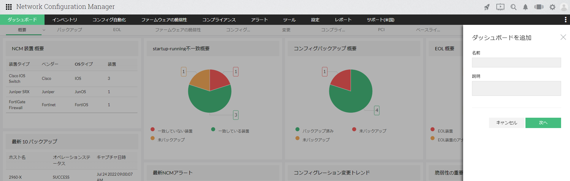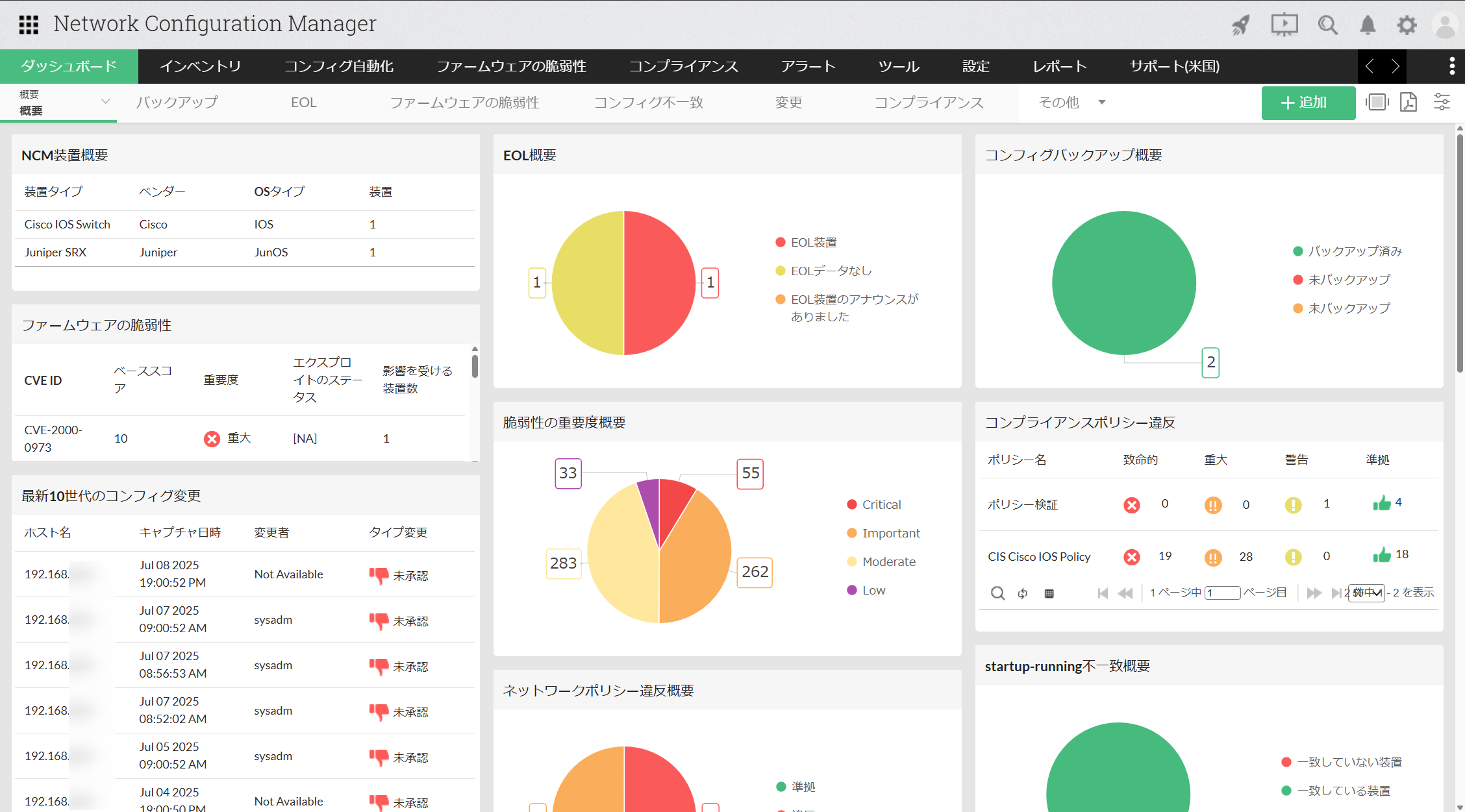 | 最新10世代のコンフィグ変更 | 直近でコンフィグ変更が発生した対象装置、変更検知日時、変更者、変更タイプ(承認/未承認)を表示します。 |