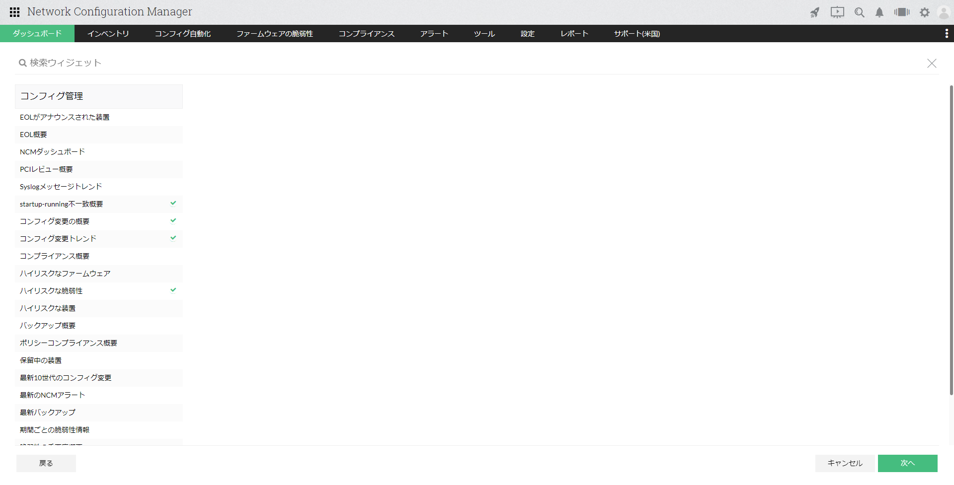 ダッシュボードに表示する項目(ウィジェット)を任意にカスタマイズすることで、管理対象装置やコンフィグ管理の状況を迅速に把握します。