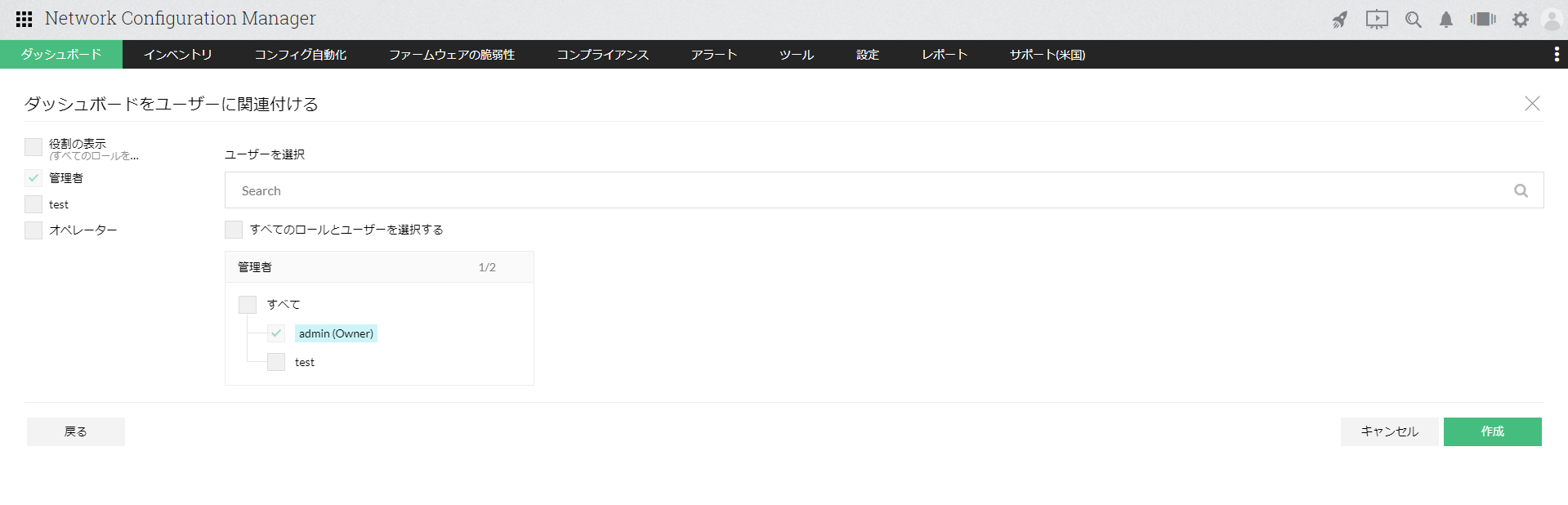 - ダッシュボードの参照を許可するユーザーを任意に選択し、[作成]