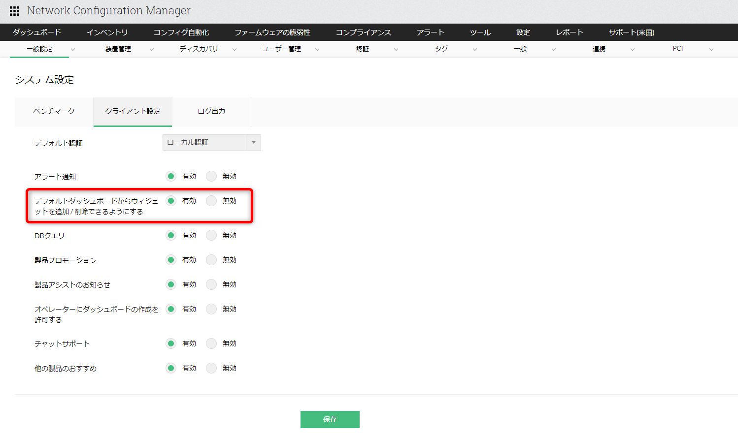 ダッシュボード追加後、[設定]→[一般設定]→[システム設定]→[クライアント設定]より、[デフォルトダッシュボードからウィジェットを追加/削除できるようにする]を有効にして保存してください。