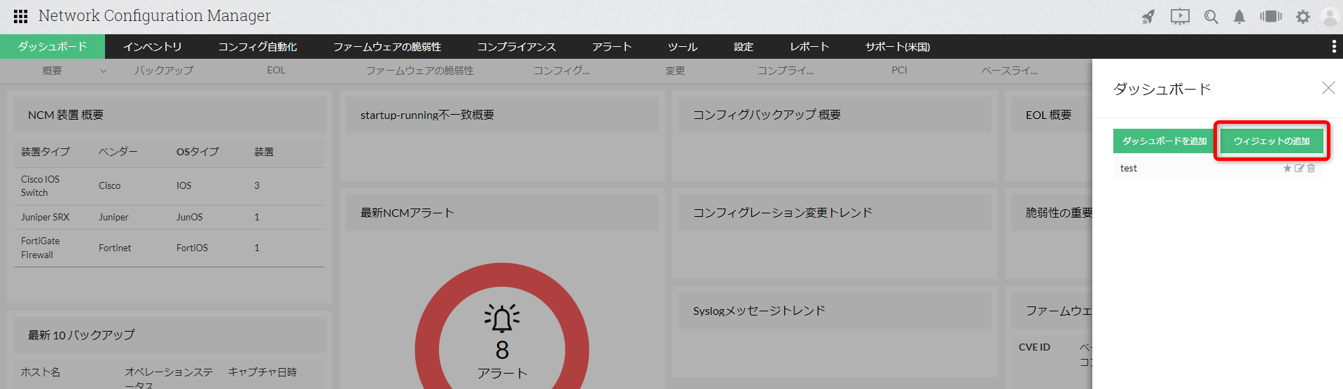 管理装置のOSに潜む脆弱性関連の情報を表示します。Network Configuration Managerをインストール後、デフォルトで以下のウィジェットを確認できます。