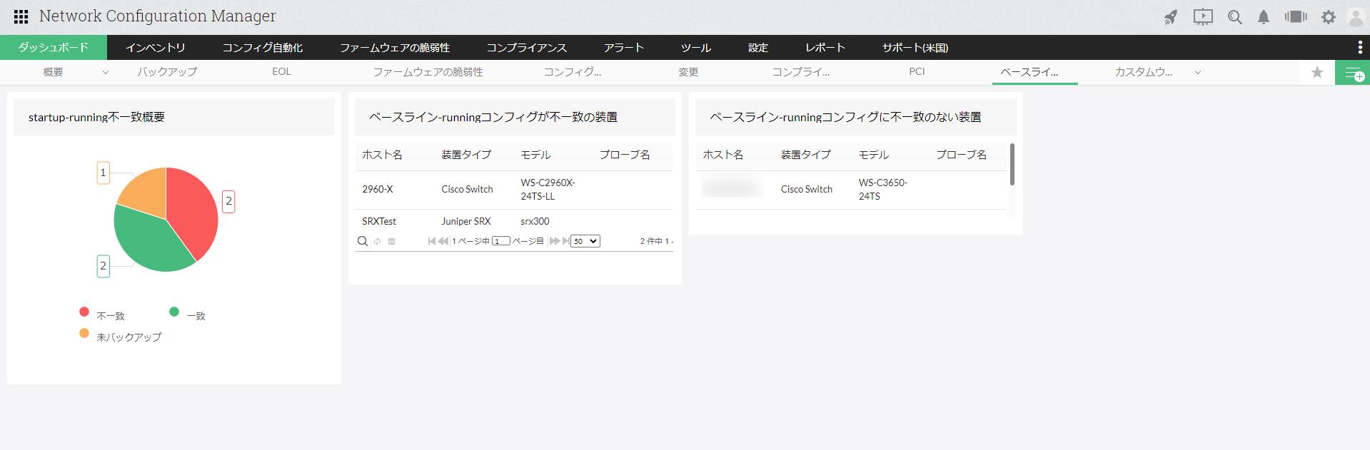 | ベースライン-running不一致 | ベースラインのコンフィグとrunningコンフィグの一致している装置、一致していない装置、未バックアップの装置数を表示します。 |