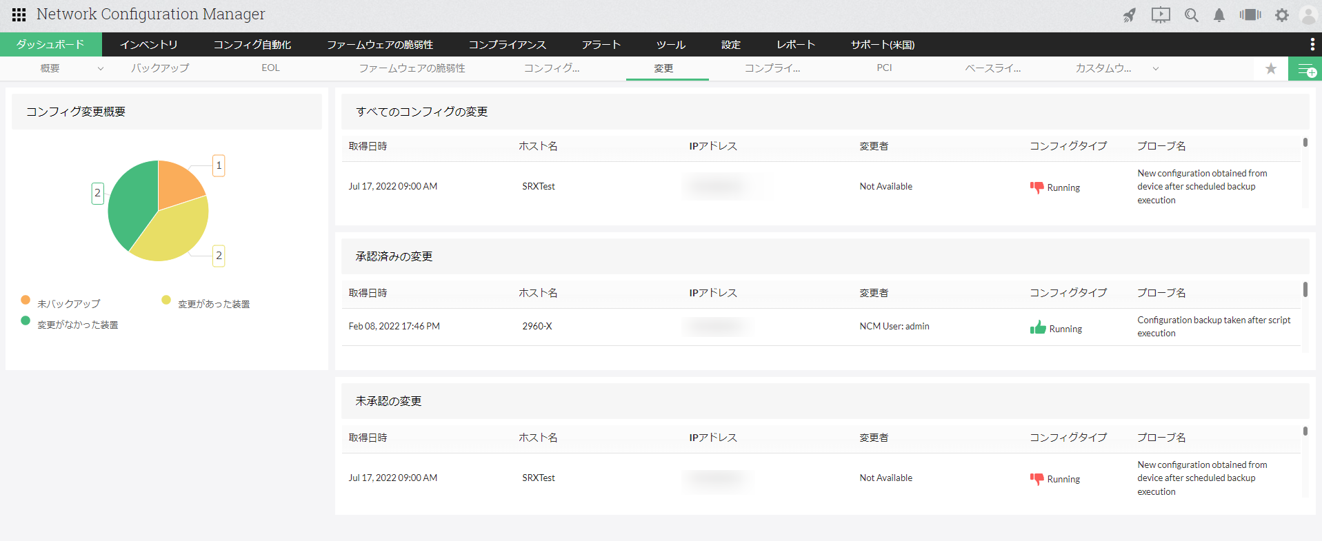 | 未承認の変更 | 未承認の変更情報(取得日時、ホスト名、IPアドレス、変更者、コンフィグタイプ)を表示します。 |