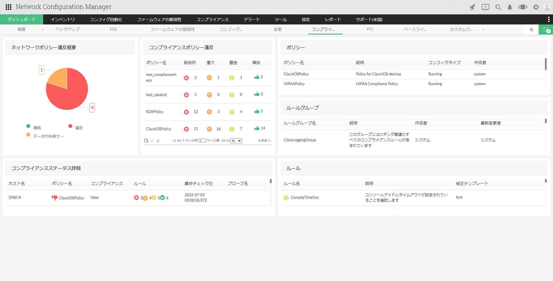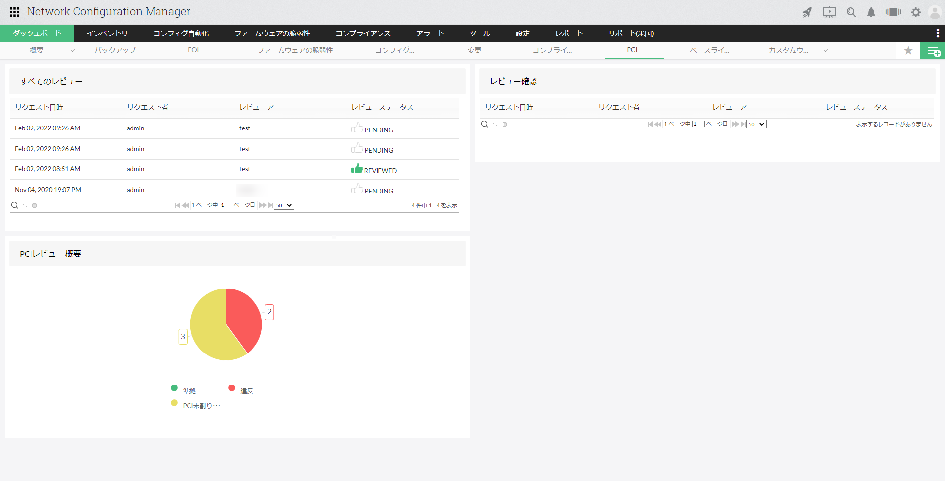 | コンフィグ(PCI)レビュー概要 | 「コンフィグレビュー」のレビュー状況(準拠、違反、PCI未割り当て)を表示します。 |