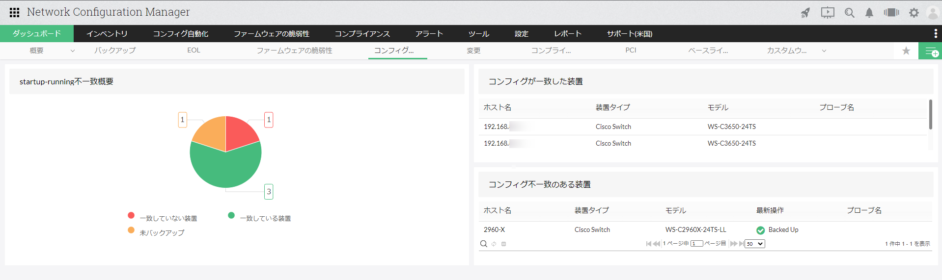 | コンフィグが一致した装置 | startupコンフィグとrunningコンフィグが一致している装置情報(ホスト名、装置タイプ、モデル)を表示します。 |