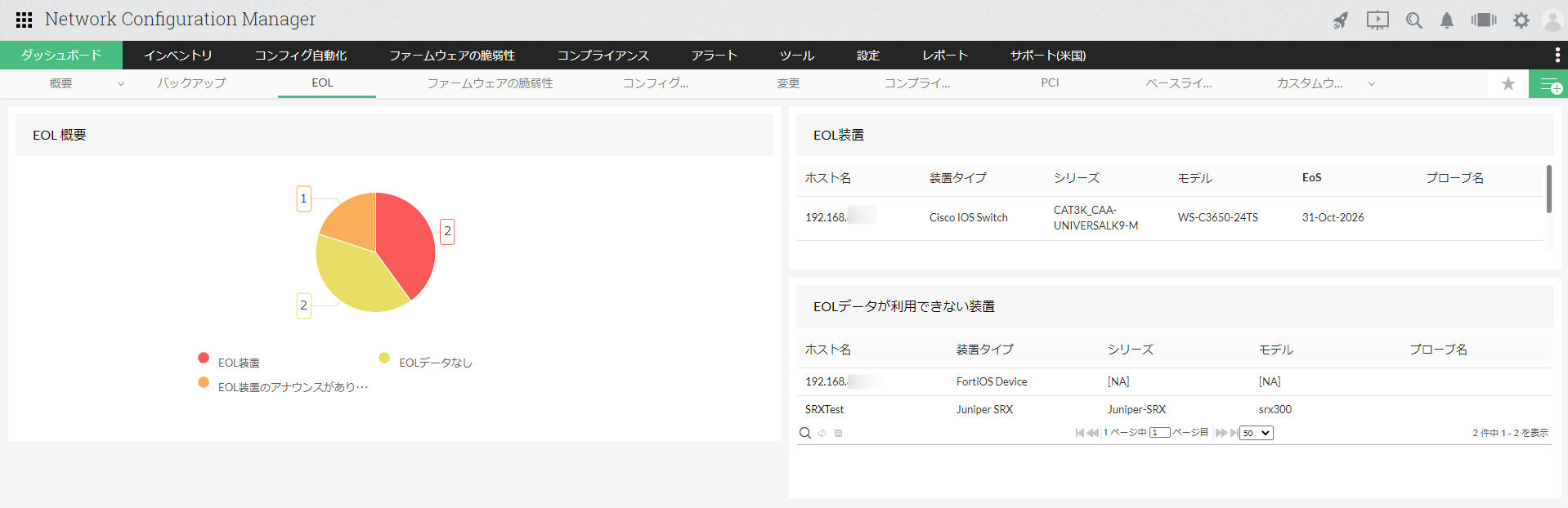 | EOL装置 | EOS(End Of Sales)、EOL(End Of Life)/EOS(End Of Support)情報が公開されている装置情報(ホスト名、装置タイプ、シリーズ、モデル、EoS)を表示します。 |