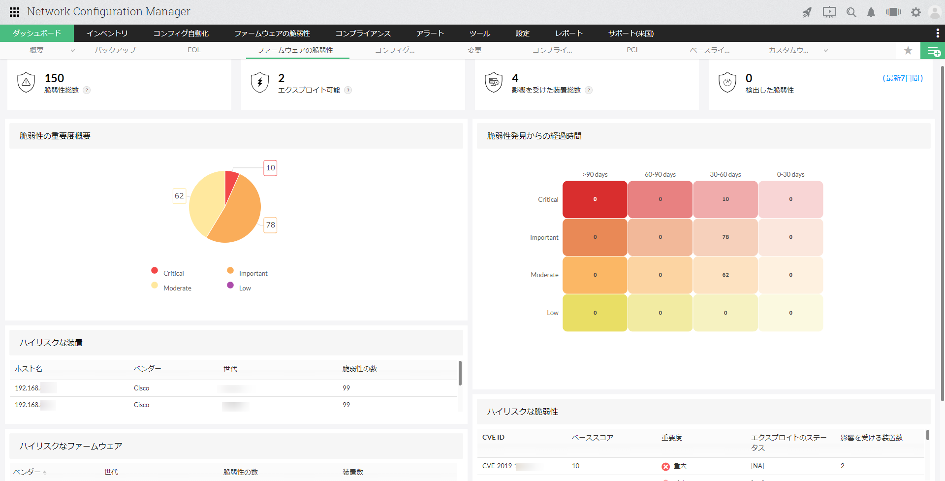 | ハイリスクなファームウェア | 重要度の高い脆弱性を含むファームウェア情報(ベンダー、OSバージョン、脆弱性の数、装置数)を表示します。 |