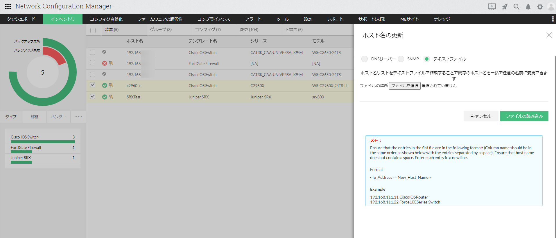 装置のディスカバリや追加の際に、DNSの問題によって装置名が正しく表示されない場合があります。その場合、ファイルインポートにより、ホスト名の一括更新ができます。
