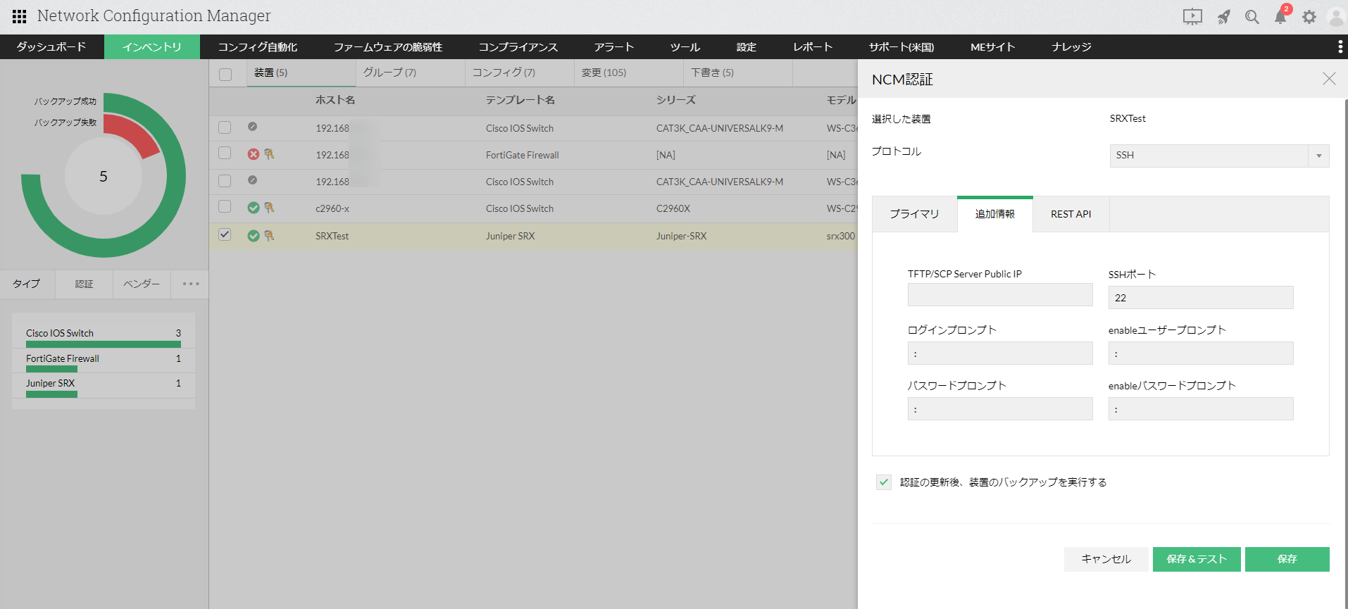 認証プロトコルを選択した際のプロトコル用のポート番号、ログインプロンプト、enableユーザープロンプト、パスワードプロンプト、enableパスワードプロンプトなど、デフォルトで標準値が割り当てられます(通常は編集不要です)。装置がNAT環境やファイアウォールの背後にある場合などは、TFTPサーバーやSCPサーバーのパブリックIPも追加情報画面から変更できます。