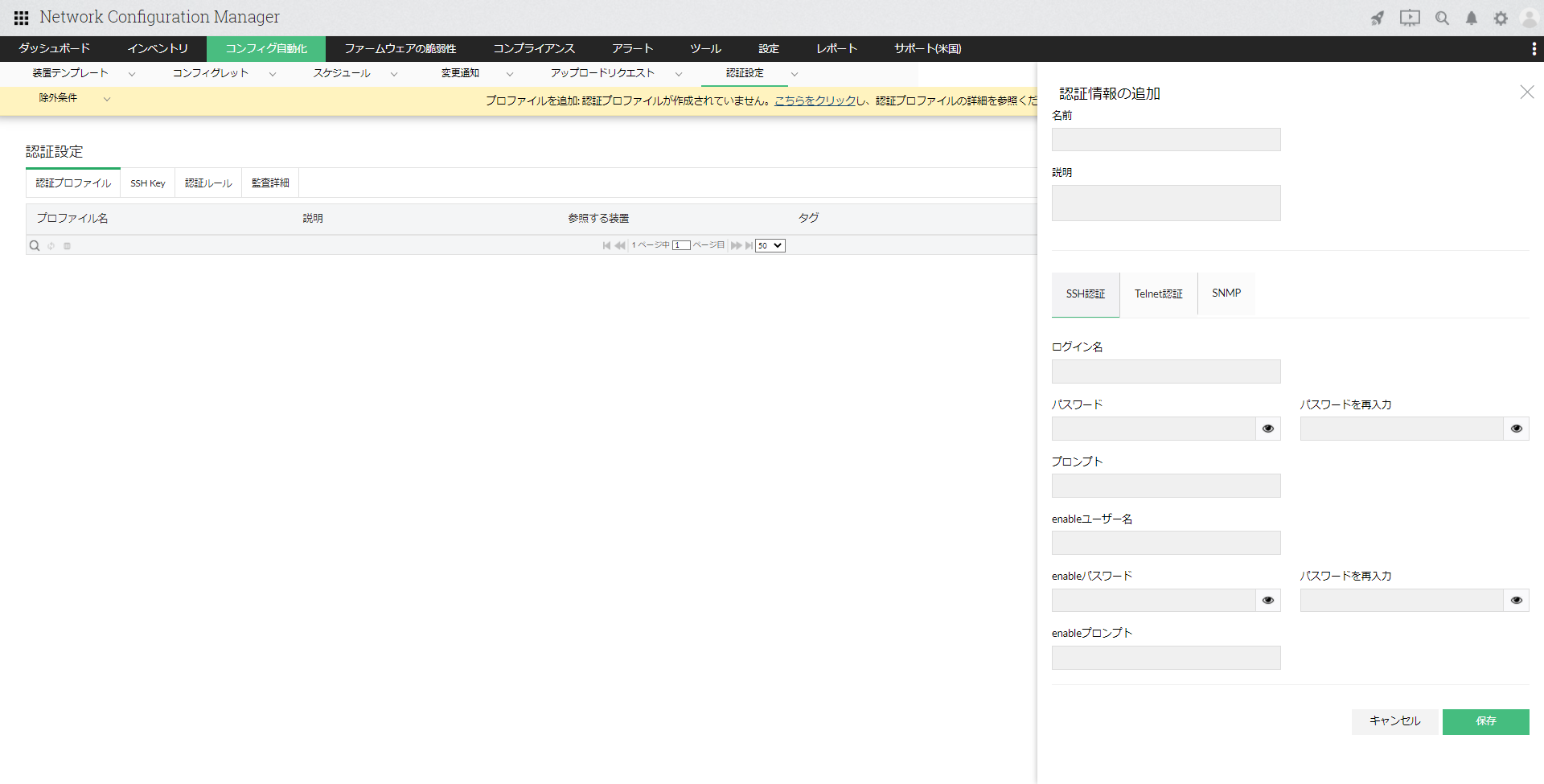 - [コンフィグ自動化]→[認証設定]→[認証プロファイル]画面を開き、画面右上の[+]をクリック