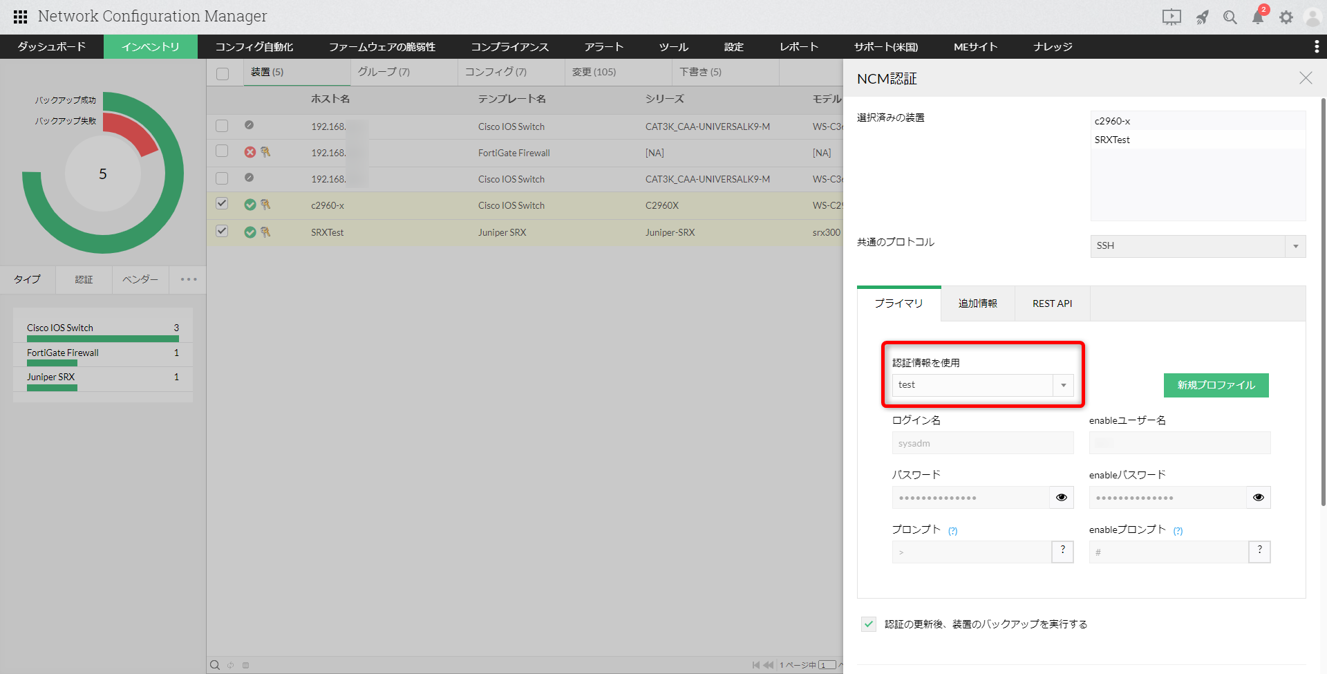 [認証の更新後、装置のバックアップを実行する]にチェックを入れると、認証情報を保存後に自動でコンフィグバックアップ操作が実行されます。