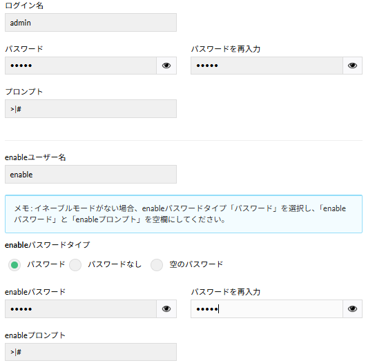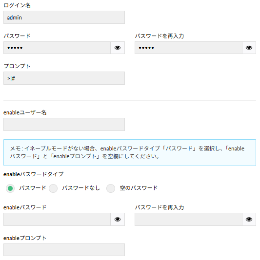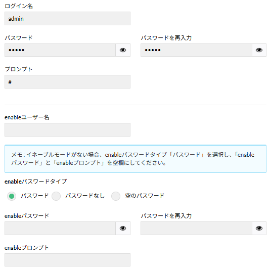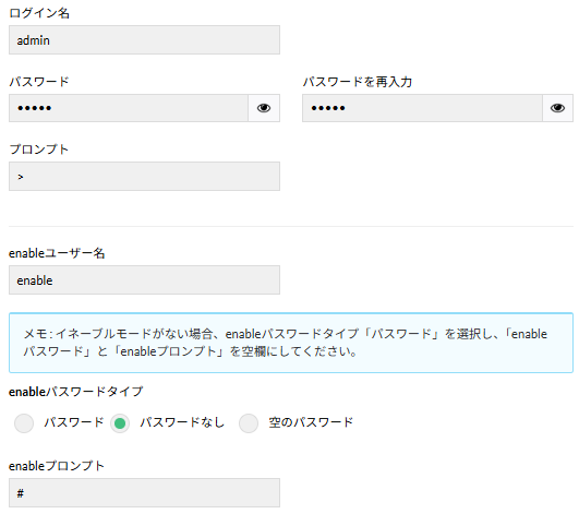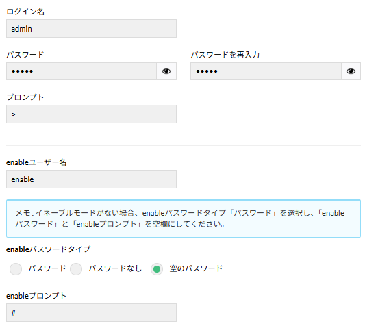 | enableユーザー名 | 特権モードに遷移するときのユーザー名情報 (Enableモードがない場合には、ダミーのユーザー名を入力してください。) |