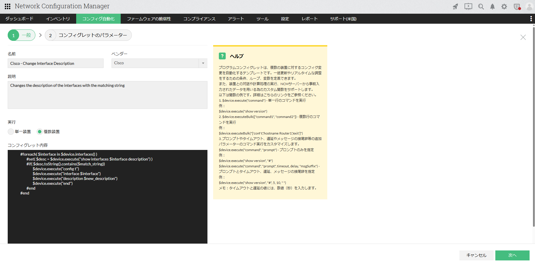 インターフェース情報の更新やSNMP設定の有効化、アクセスコントロールリストなど反復的な操作にかかる工数を削減します。