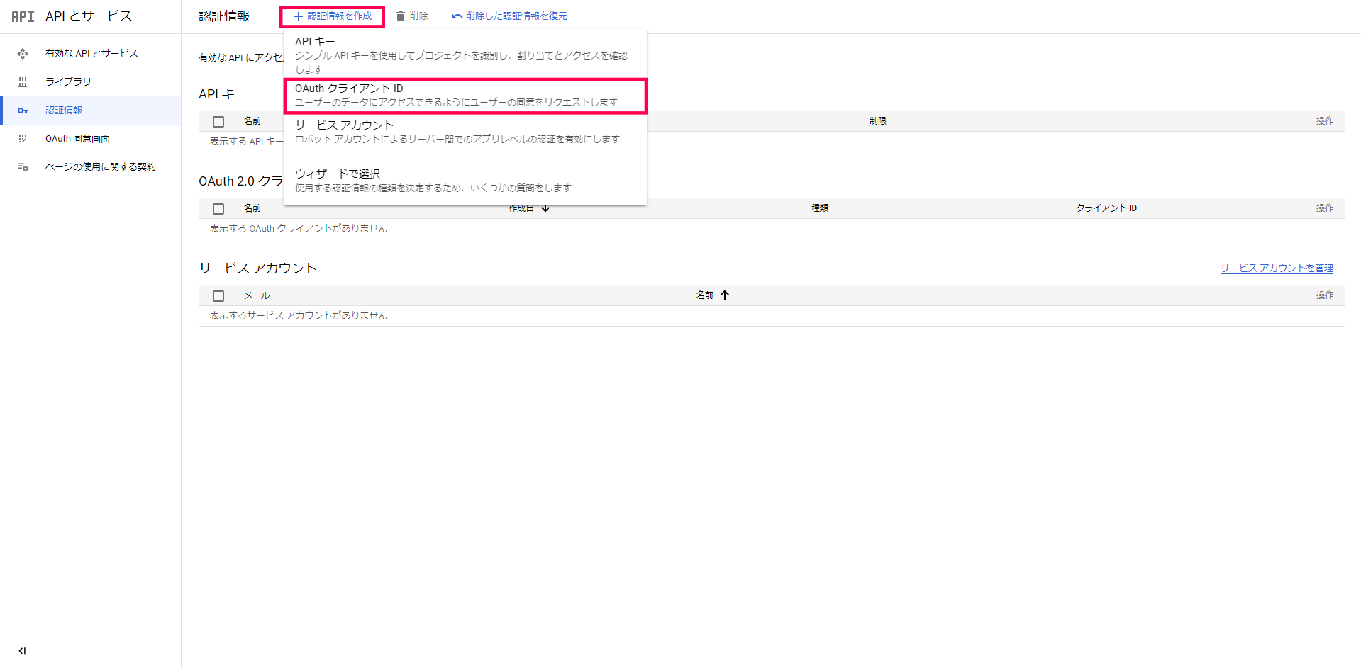 - [認証情報を作成]→[OAuth クライアント ID]の順にクリック