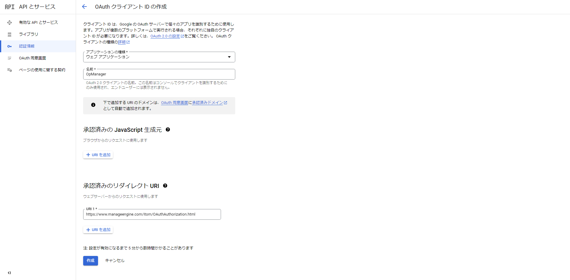 [承認済みのリダイレクト URI]で[URLを追加]をクリックし、以下のURLを入力して[作成]をクリック