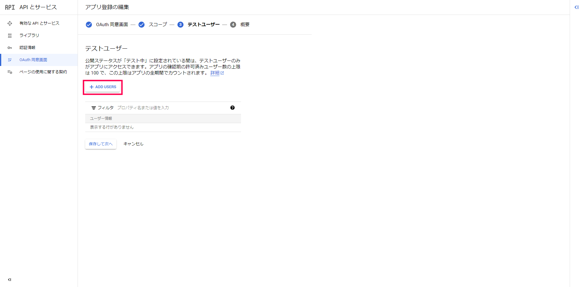 - [ADD USERS]から必要に応じてテストユーザーを追加し[保存して次へ]をクリック