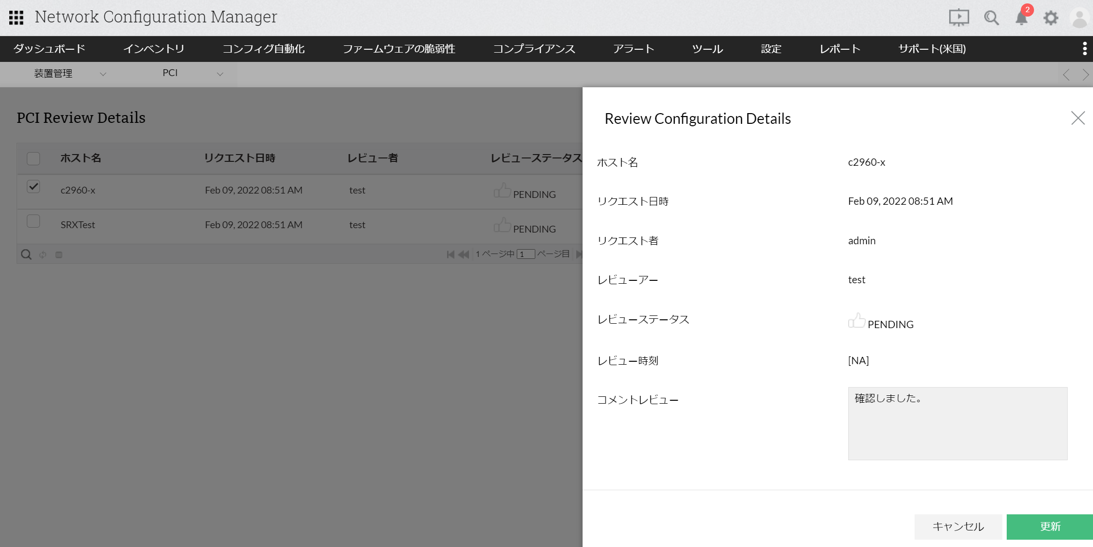 - レビュアーのアカウントで、Network Configuration Managerにログインし、[設定]→[コンフィグレビュー(PCI)]→[レビュー確認]画面を表示