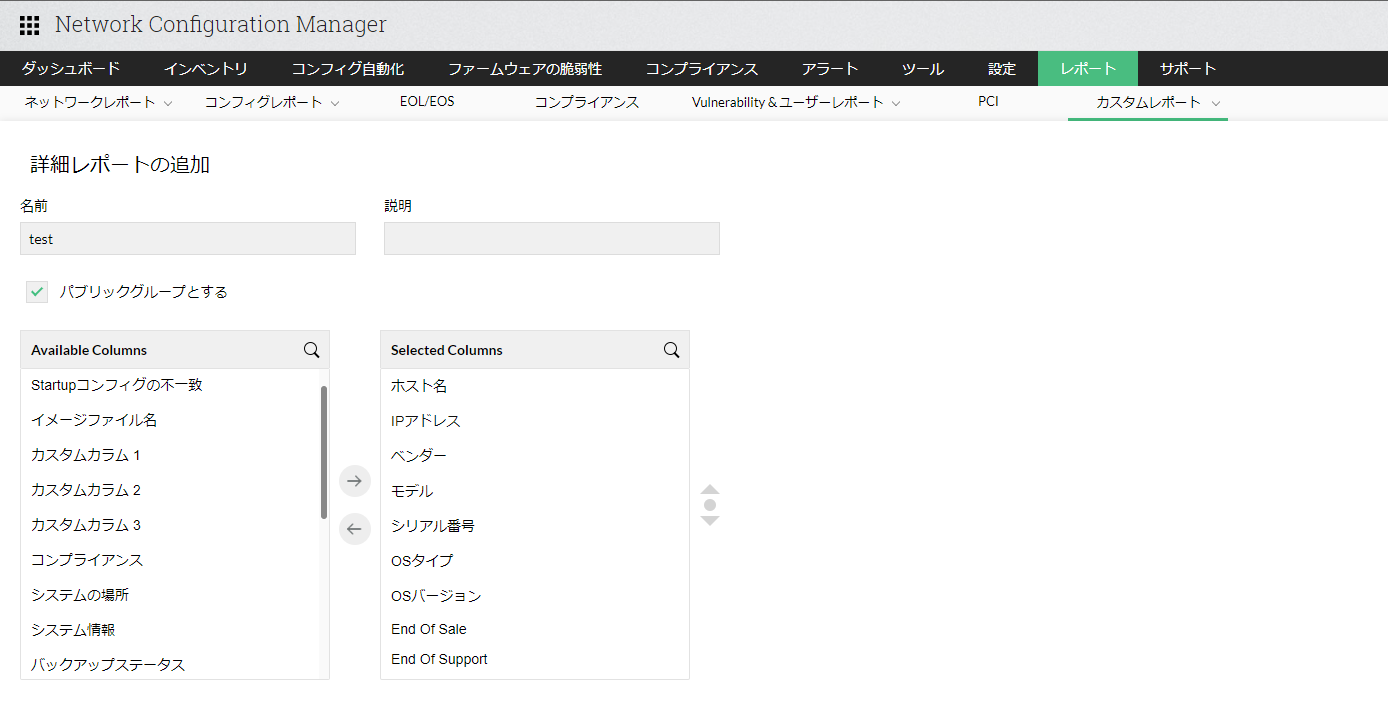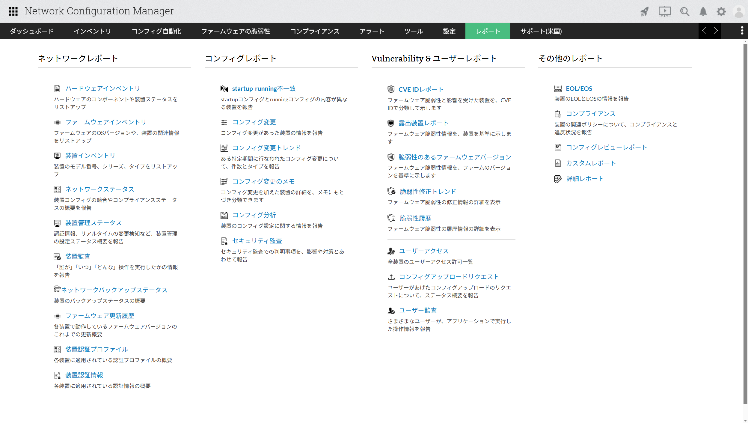 その他レポート(EOL/EOS、コンプライアンス、コンフィグレビューレポート(PCI)、詳細レポート、カスタムレポート)