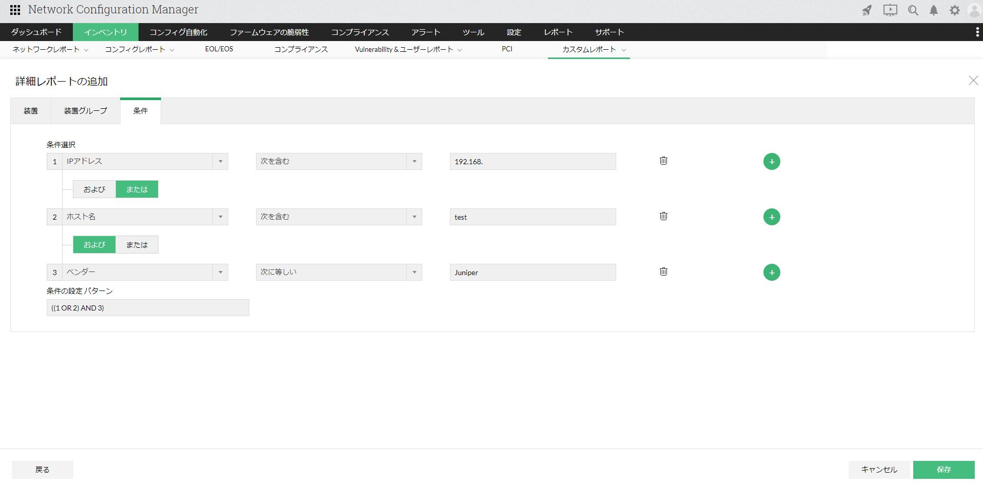 任意のカラムを指定して、独自のレポートを作成します。 装置個別、装置グループ、特定の条件指定により、該当装置の各カラム情報を表示します。 ※PDF、CSV、XLSXで出力可能です。 選択可能なカラム: 認証ステータス、End Of Sales、End Of Support、IPアドレス、MACアドレス、管理ステータス、OSタイプ、OSバージョン、Startup不一致、イメージファイル名、カスタムカラム、コンプライアンス、システムの場所、システム情報、システム番号、シリーズ、バックアップステータス、プロトコル、ベンダー、ベースライン不一致、ホスト名、モデル、変更検出、最新オペレーションステータス、最新バックアップ、装置タイプ、装置テンプレート |