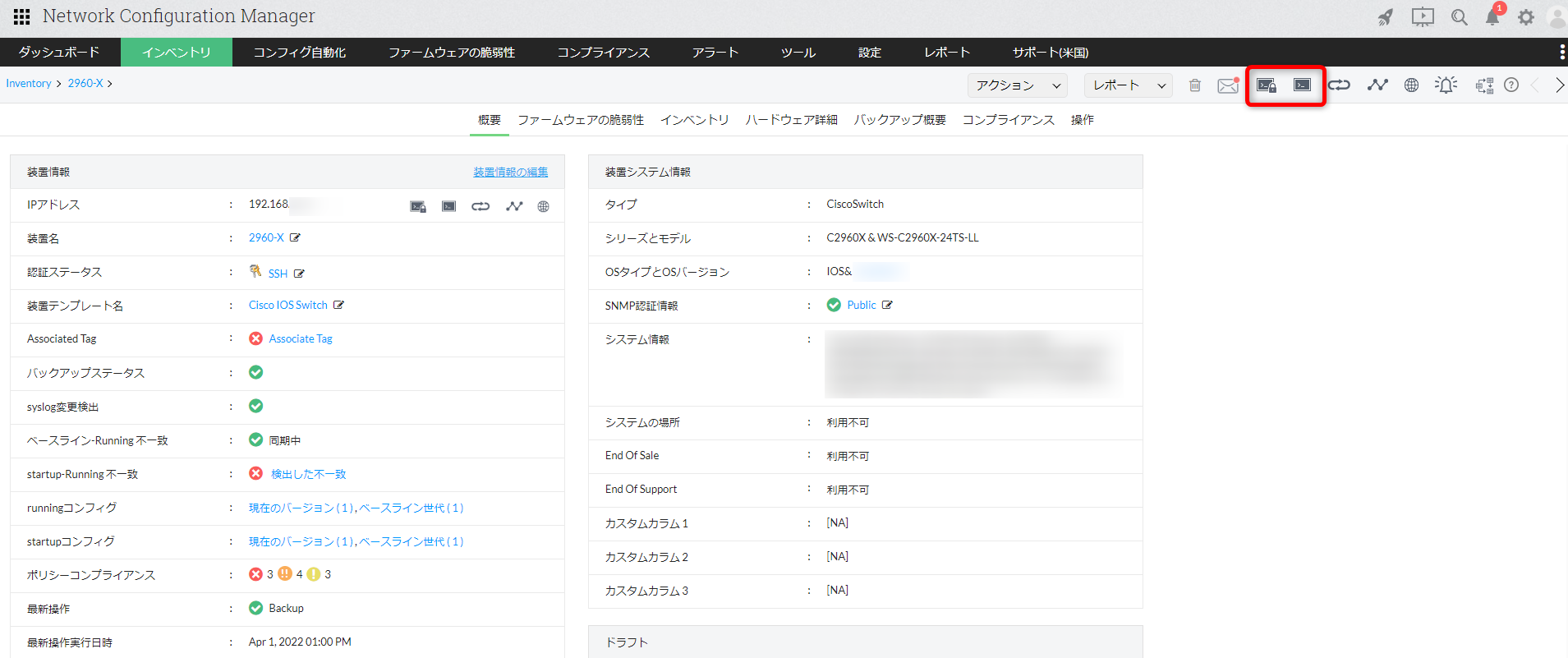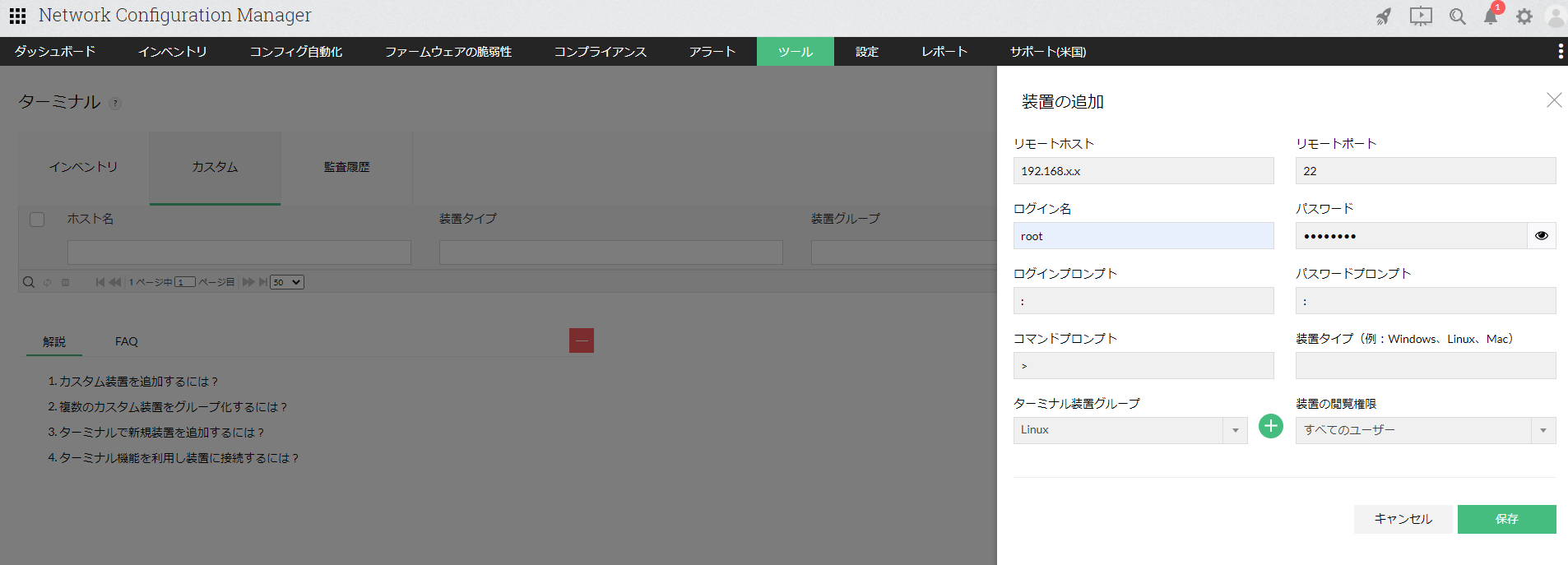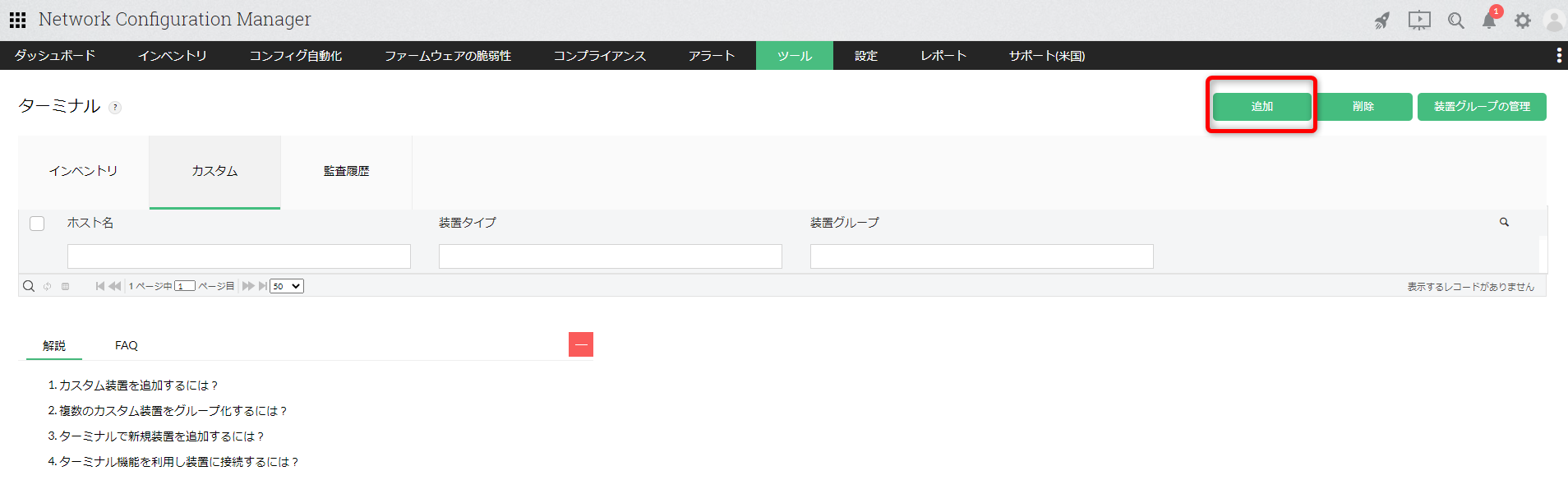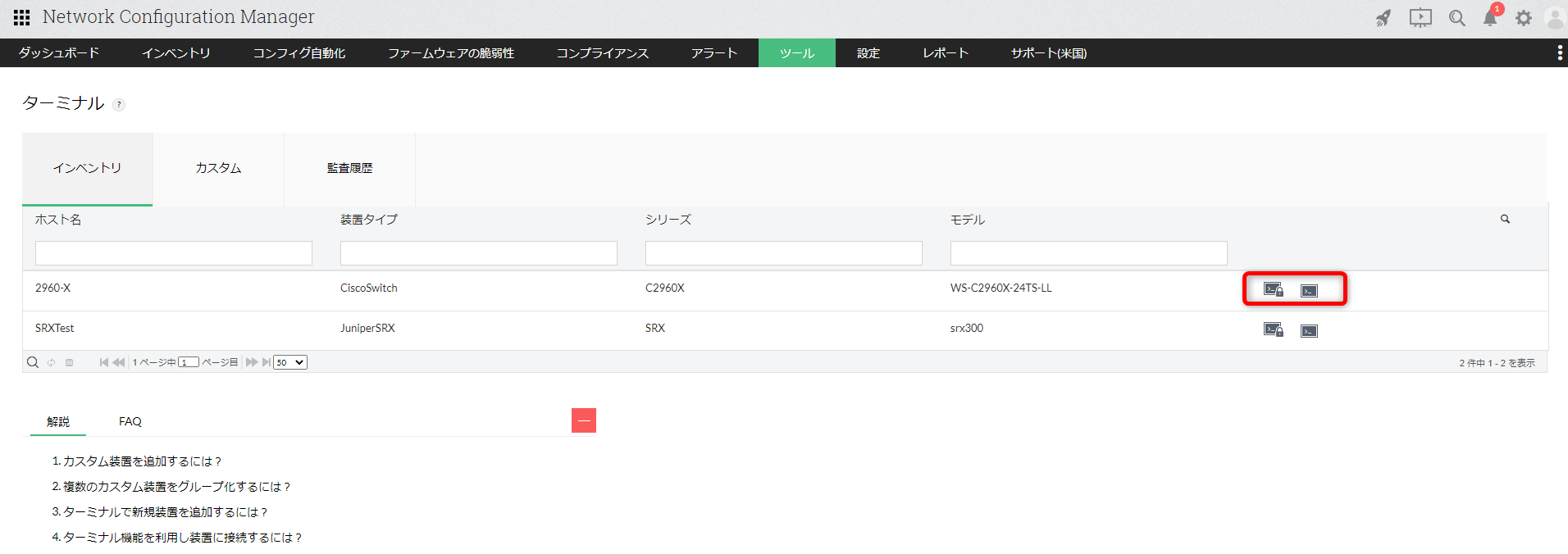 - [ツール]→[ターミナル]→[インベントリ]→対象装置のターミナルアイコン