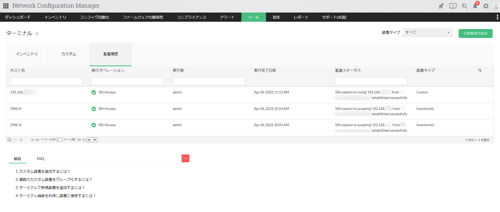 画面右上の[CSV形式で出力]では、監査履歴の一覧をCSV形式で出力することができます。