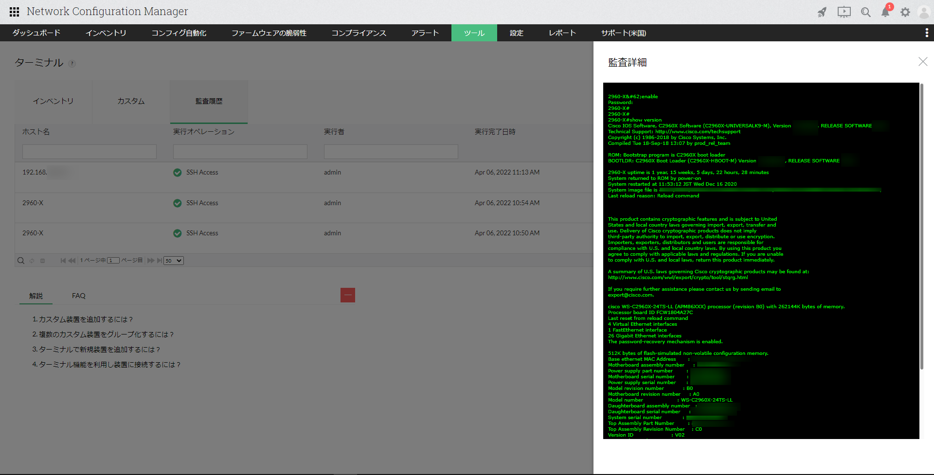 ターミナル機能の操作は、[ツール]→[ターミナル]→[監査履歴]から確認します。