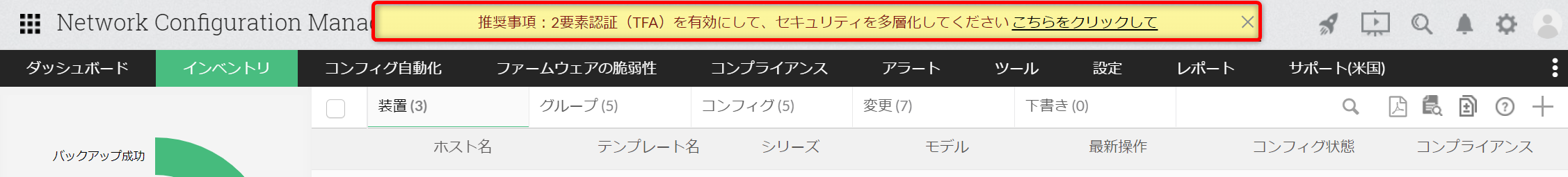 挙動については、こちらのページをご参照ください。 - 2要素認証を有効化すると、Network Configuration Managerで作成されているその他のユーザーアカウントにも設定が有効化されます。