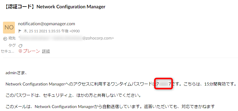 ログインユーザーに設定されたメールアドレス宛てに、認証用のワンタイムパスワードが送信されます。