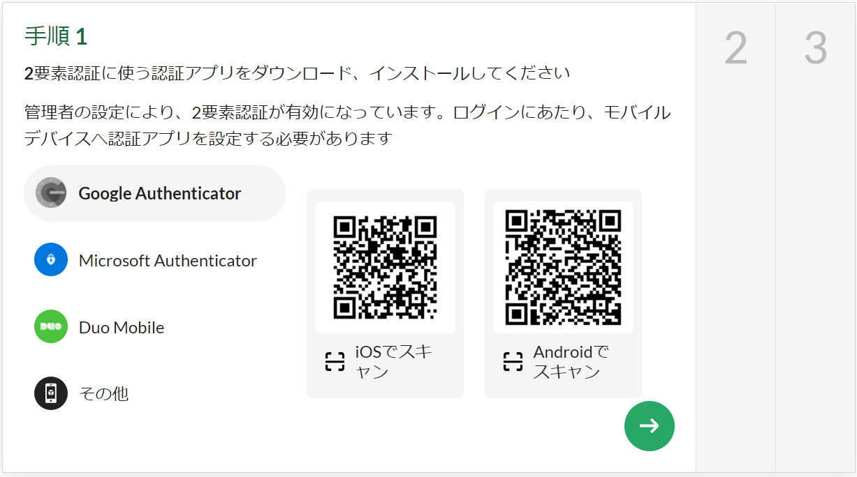 認証に使用するアプリを選択し手順2に進むと、ユーザー専用のQRコードが表示されます。