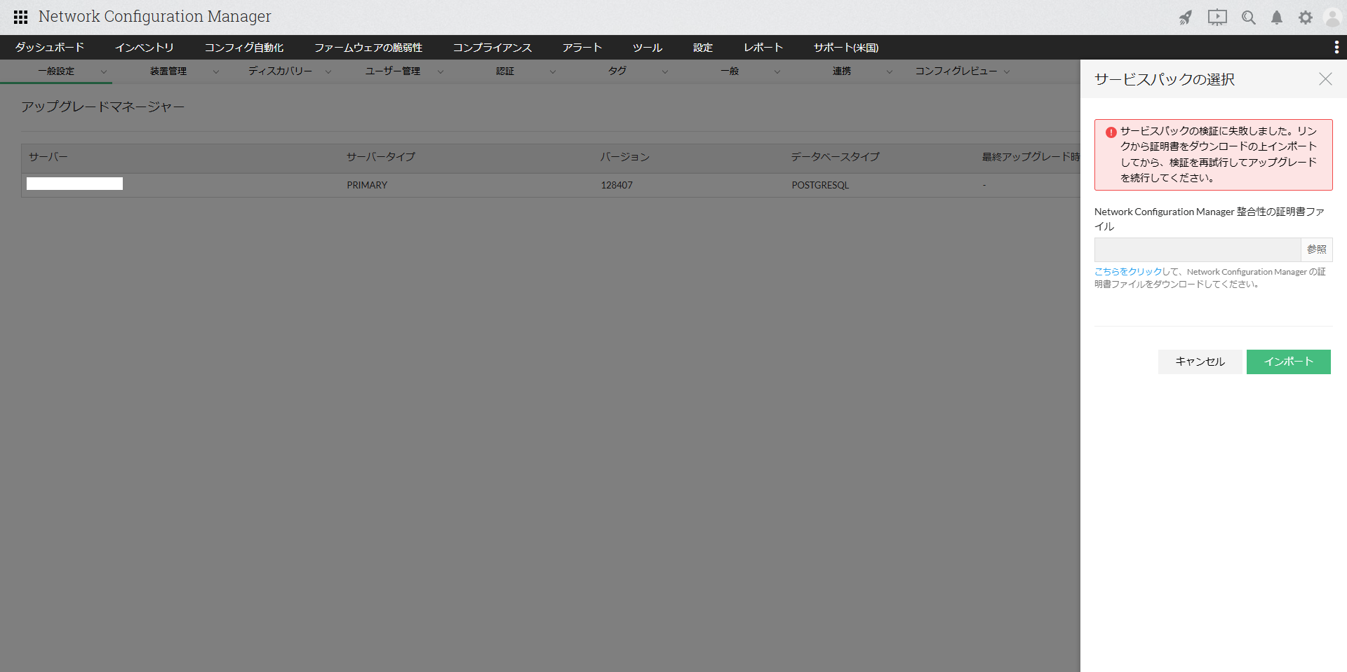 こちらから証明書をダウンロードの上、「Network Configuration Manager 整合性の証明書ファイル」でファイルを指定して[インポート]をクリックします。証明書のインポートが不要な環境の場合、この手順は発生しません。 -
