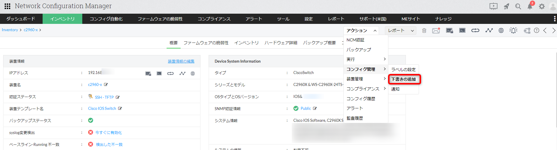 - スナップショット画面上部の[アクション]のドロップダウンから、[コンフィグ管理]→[下書きの追加]をクリック