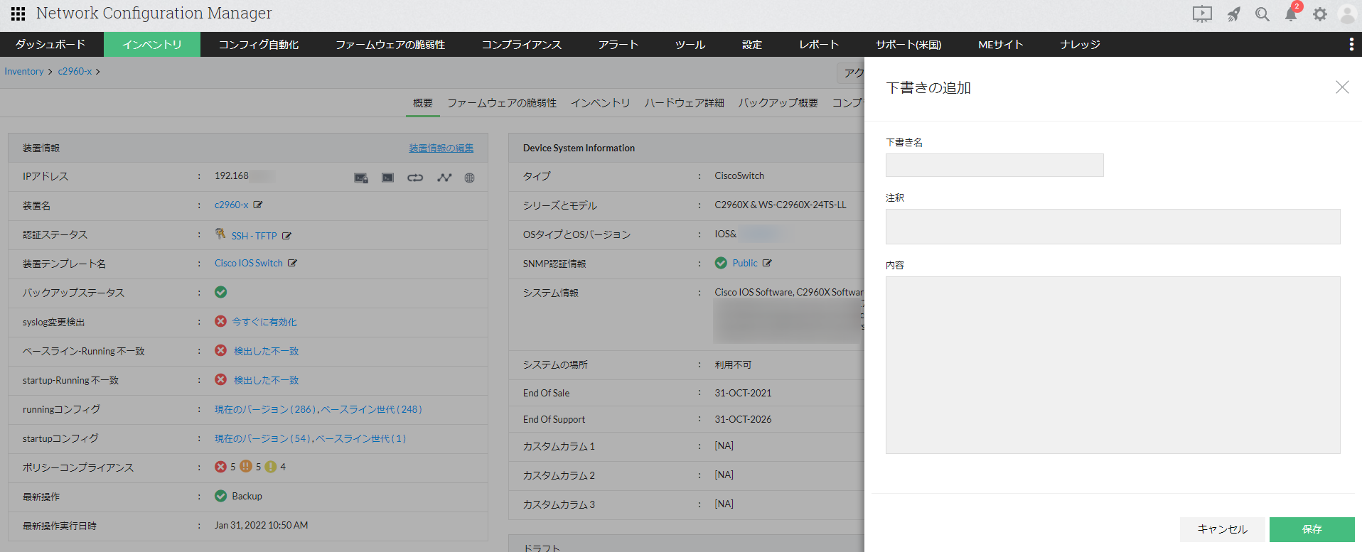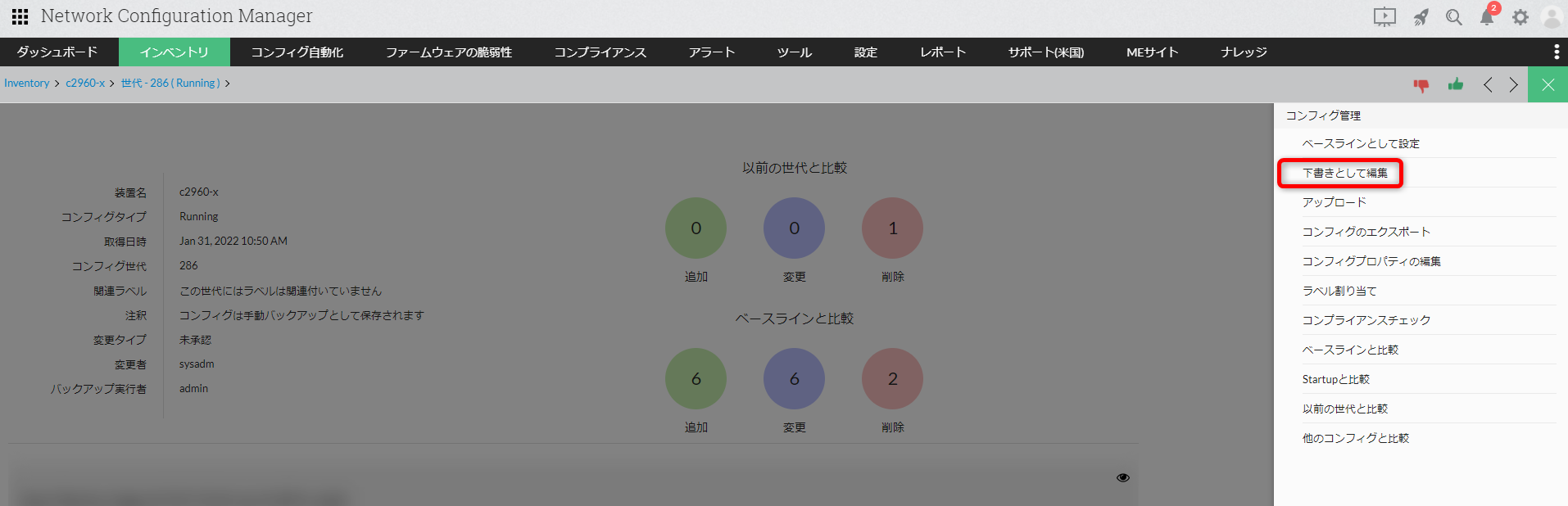 startup/runningコンフィグ取得履歴から任意のバージョンを選択して、下書きとして編集することができます。