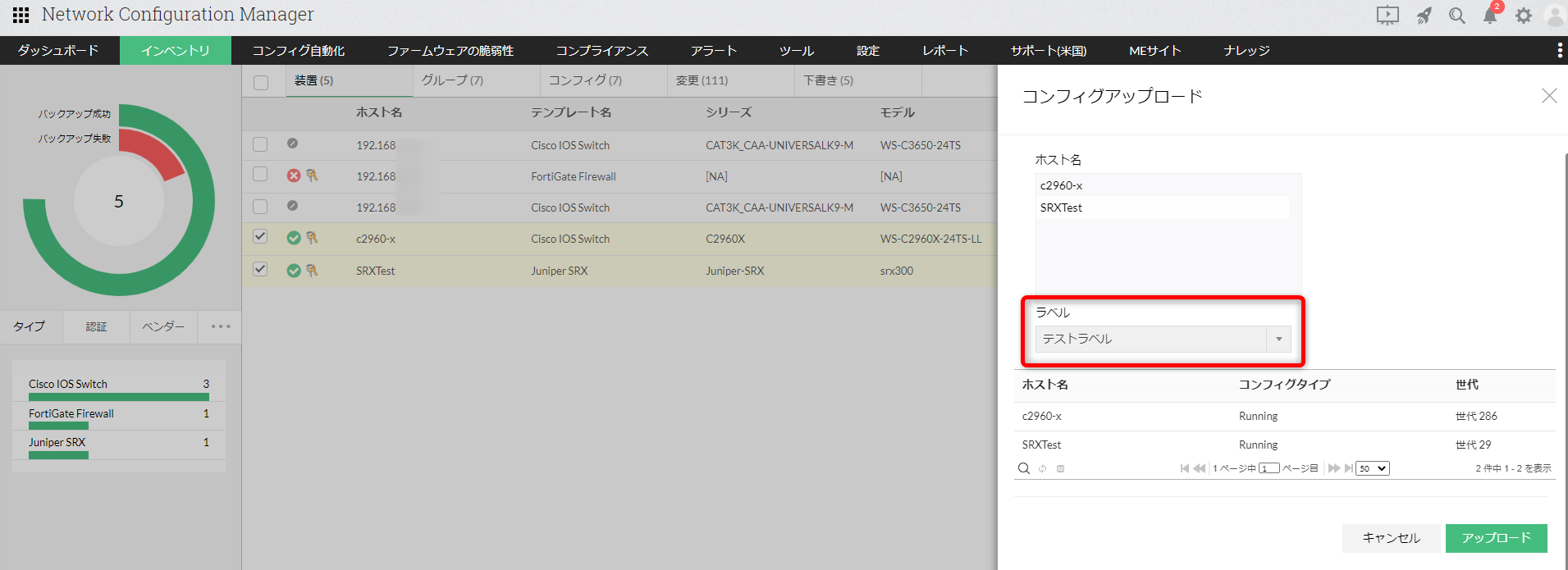 ラベルを指定して、複数装置に一括でコンフィグをアップロードすることも可能です。