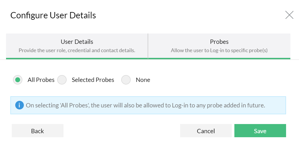 - 「選択されたプローブ」が割り当てられている場合、それらのユーザーは割り当てられた特定のプローブへのログインが許可され、残りのプローブにはログインできません。ただし、そのユーザーはセントラル サーバーから個々のプローブを管理できます。