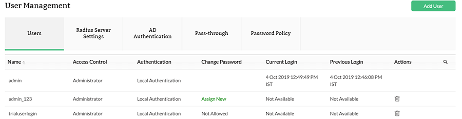 - 表示されたUIで、ユーザー名ごとの削除アイコンをクリックします。ユーザーはセントラル サーバーから削除され、セントラルから装置を管理できなくなります。