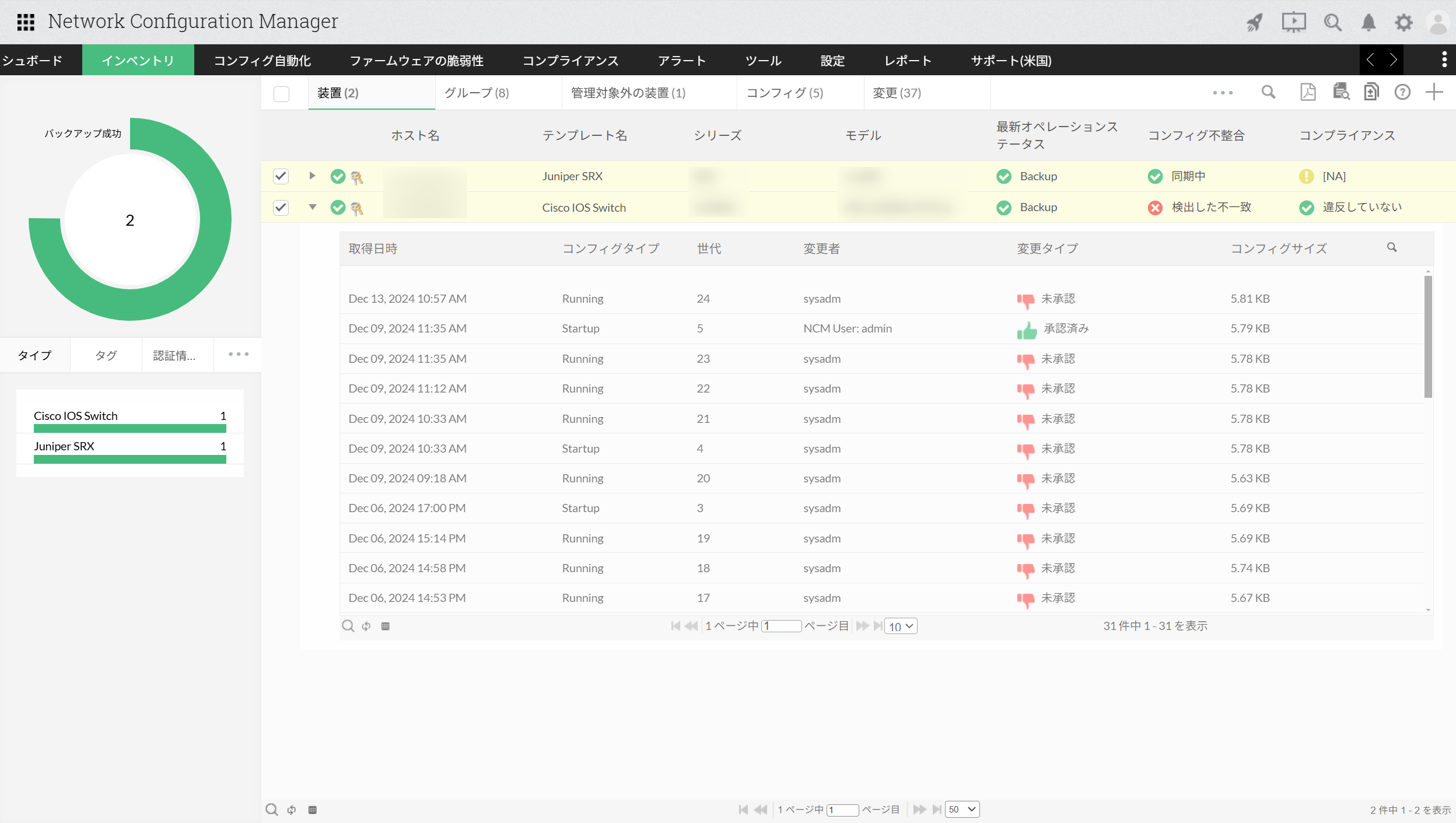 管理装置(ホスト)名の左側にある▶(三角)アイコンをクリックすることで、コンフィグの「取得日時」や「コンフィグタイプ」、「世代」や「コンフィグサイズ」を確認することが可能です。