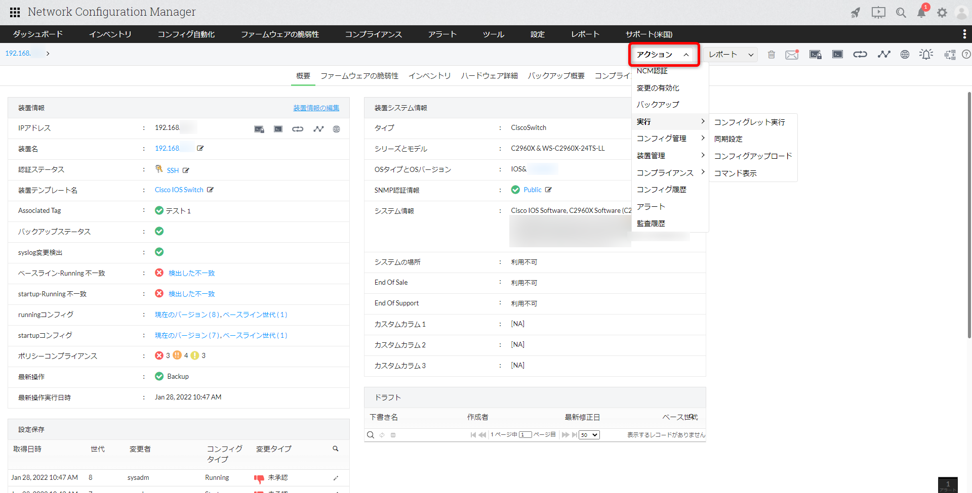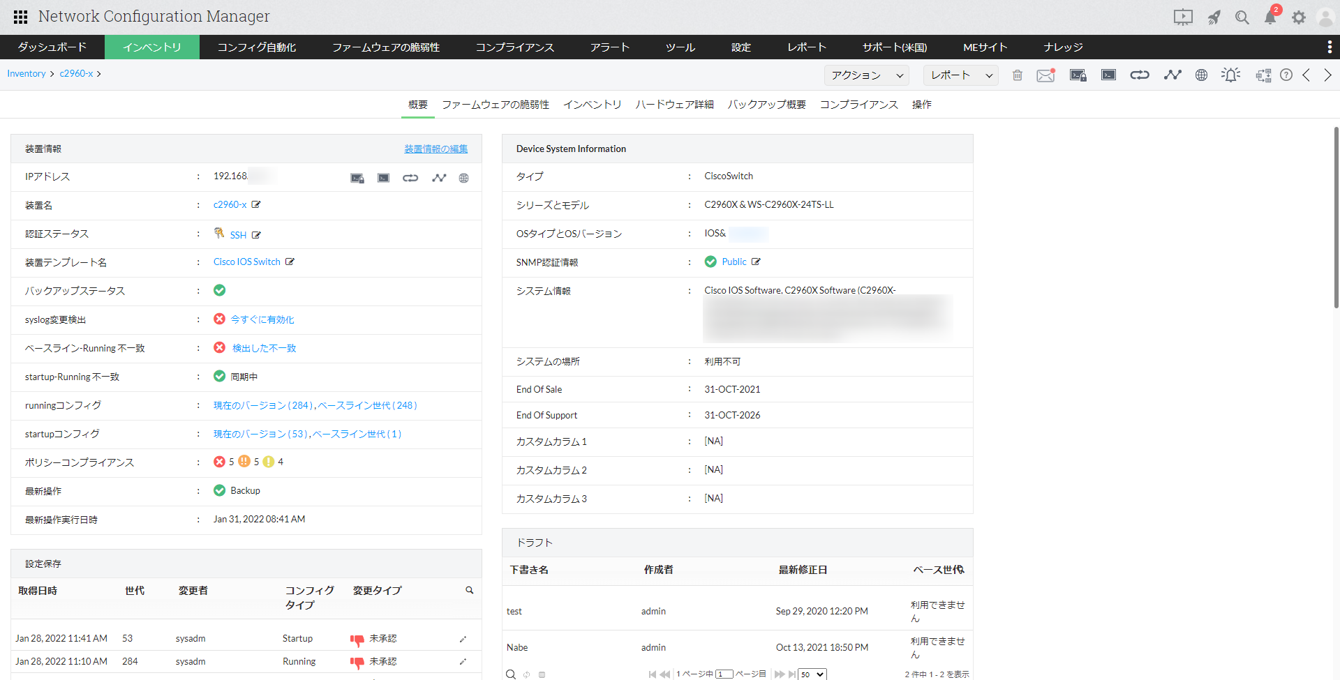 | 概要 | 対象装置の概要情報を表示します。 IPアドレス、装置名、適用されている装置テンプレート名、バックアップステータス、Running/Startupコンフィグバージョン...etc |