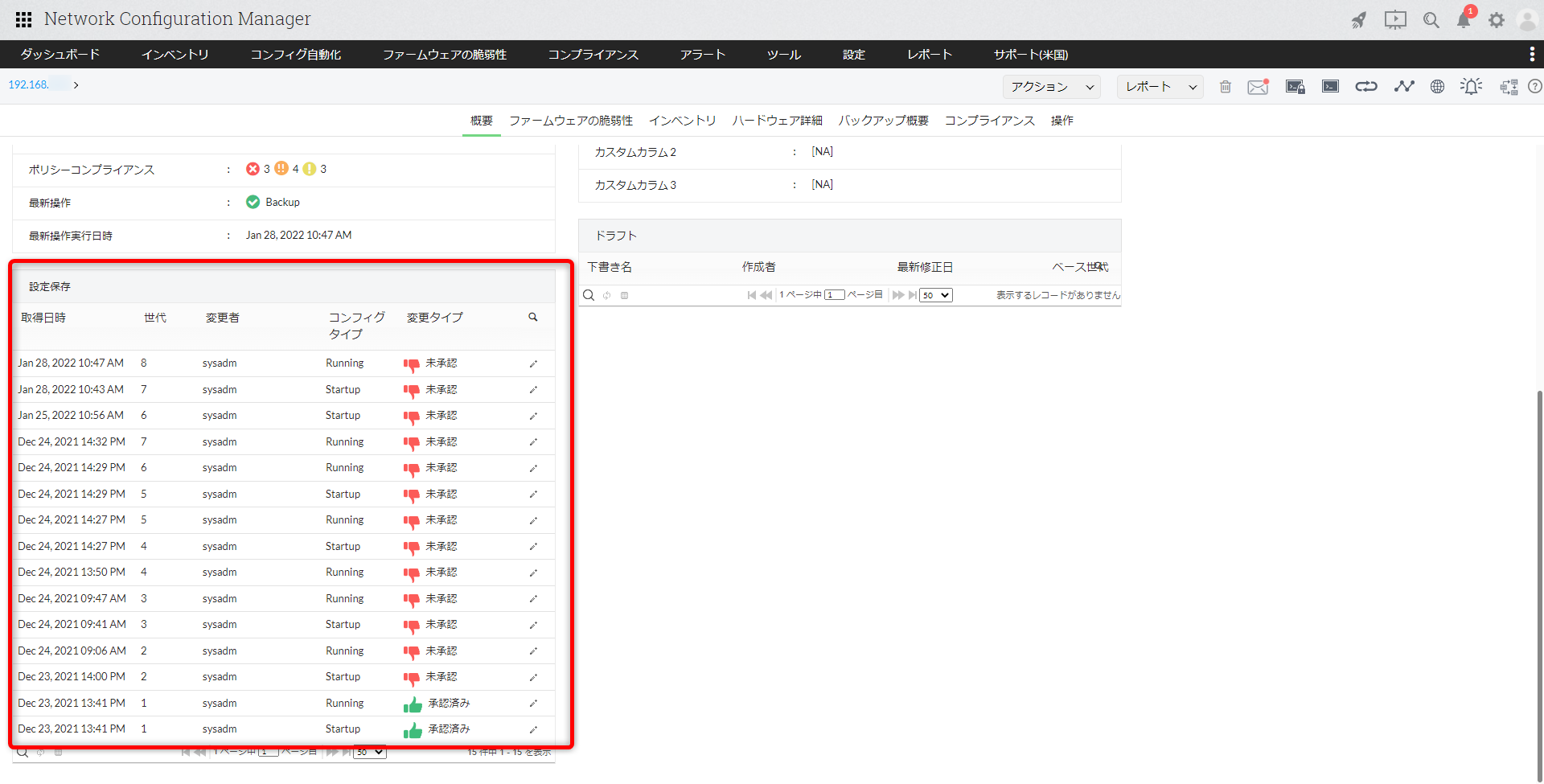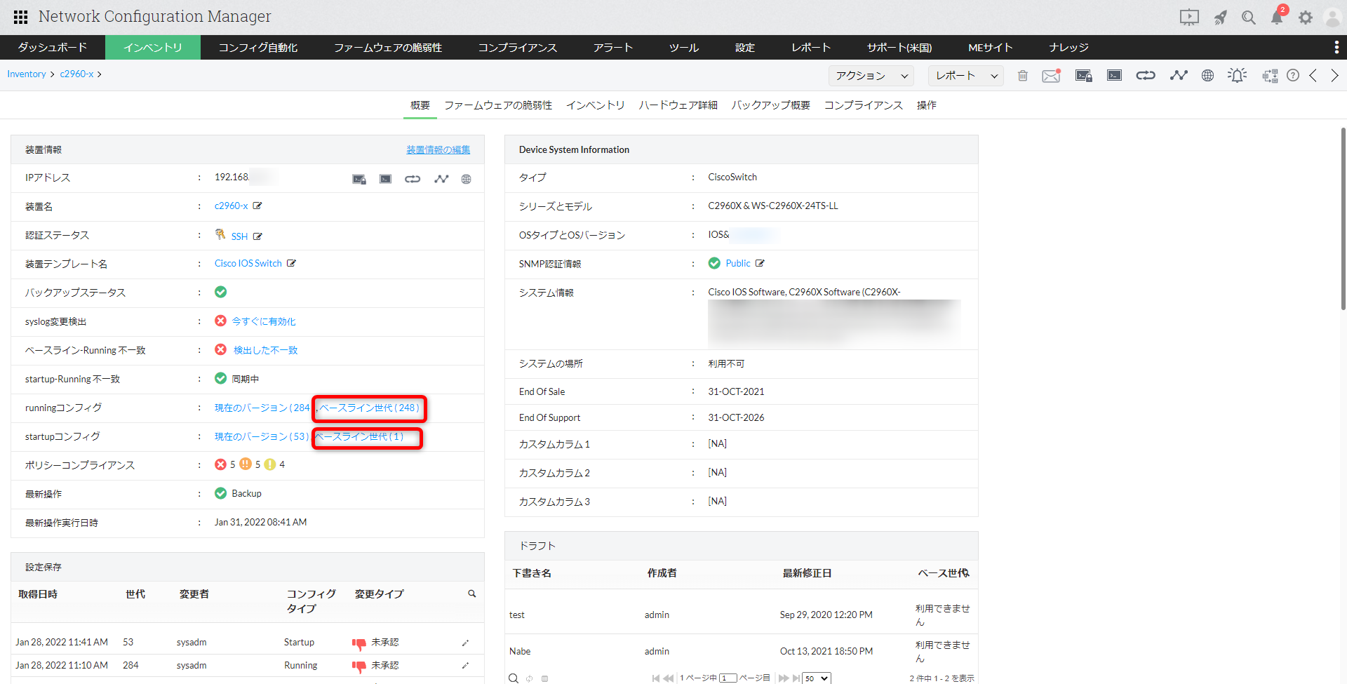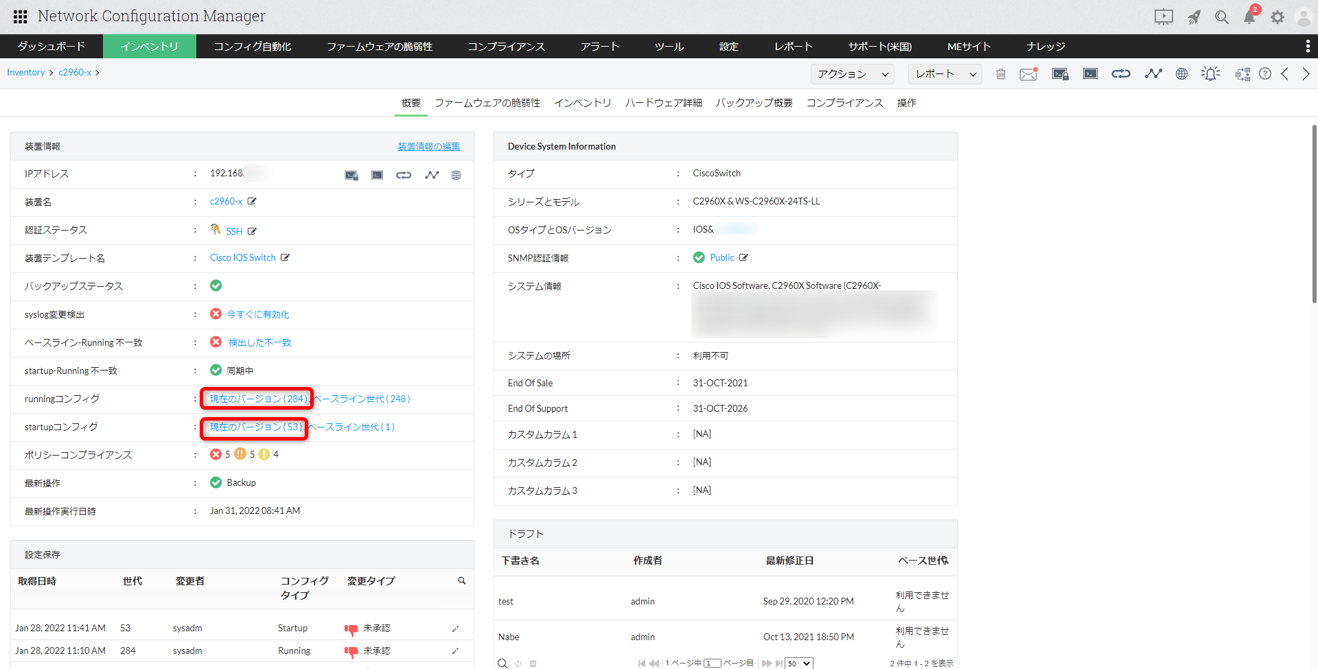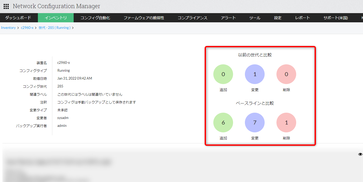 - 現在のバージョン:Network Configuration Managerで取得した最新のコンフィグ世代を指します(startup/runningそれぞれ表示されます)。