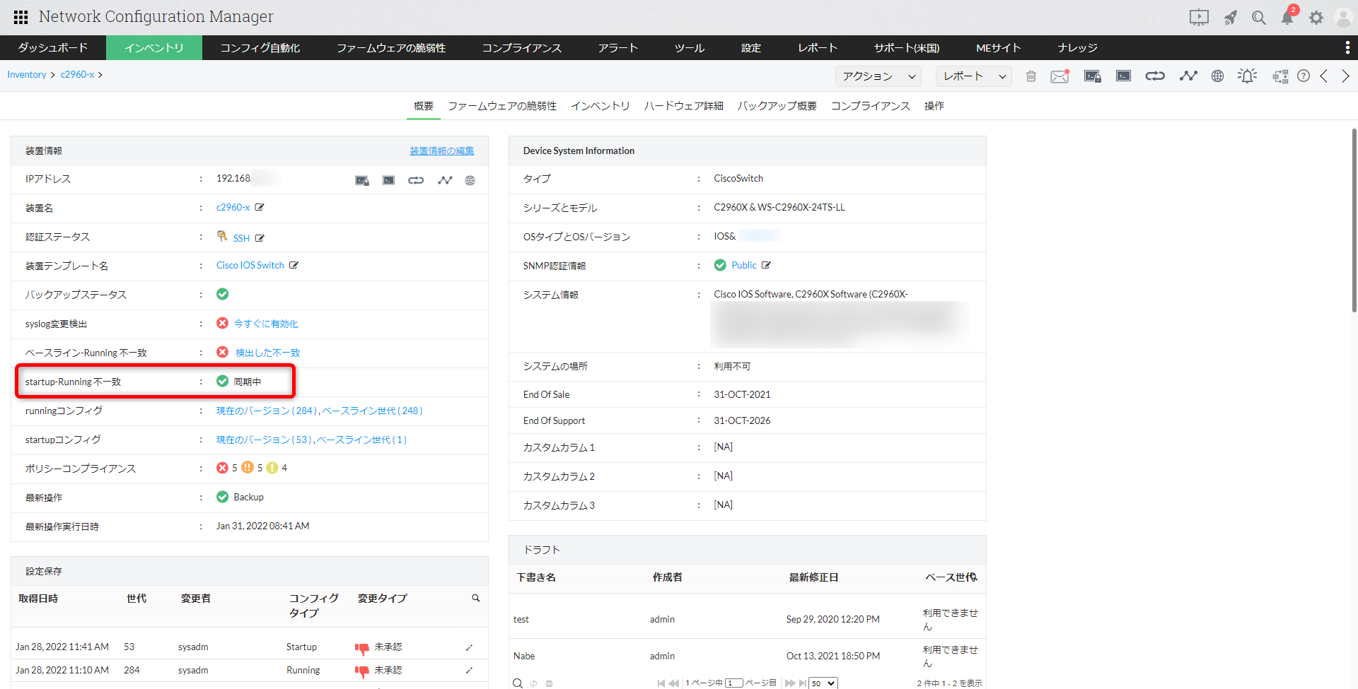 取得したRunningとStartupコンフィグに差分がある場合、[概要]タブ→[装置情報]ウィジェットの[Startup-Running不一致]のステータスが[検出した不一致]と表示されます。