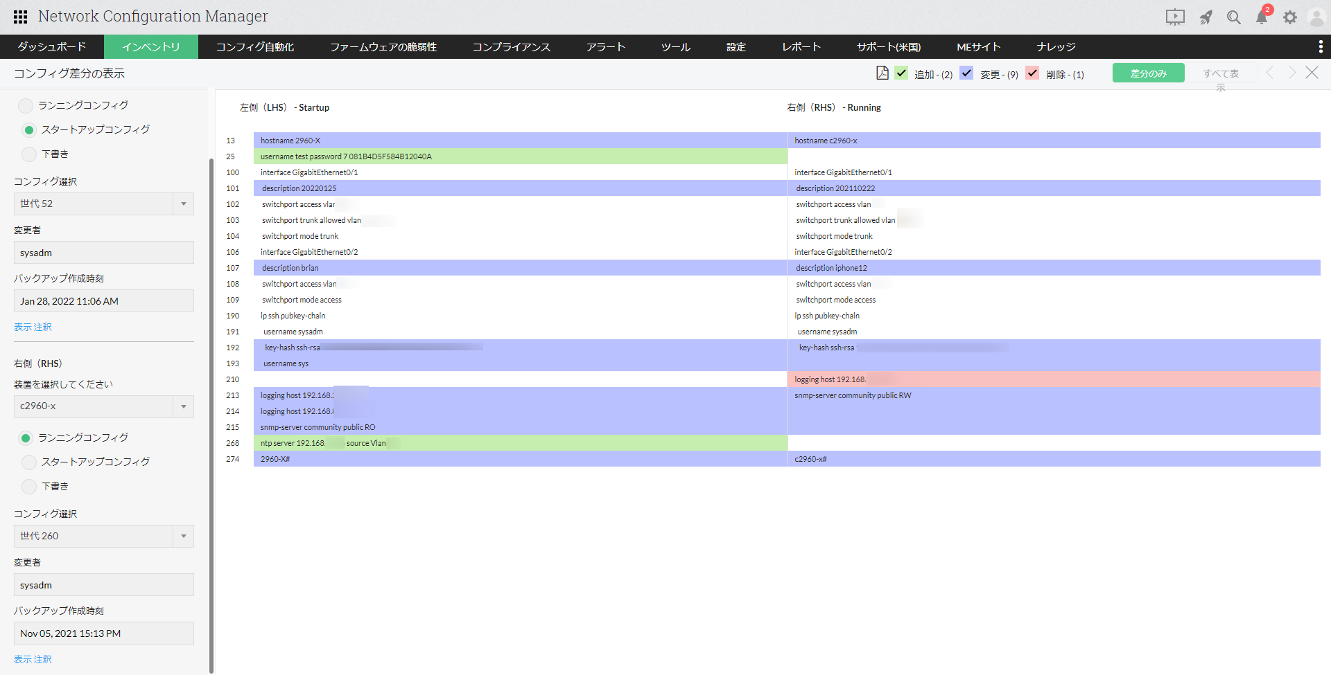 Network Configuration Managerでは、特定のコンフィグ世代を、2つ並べて差分を比較することができます。以下を対象に比較を行います。