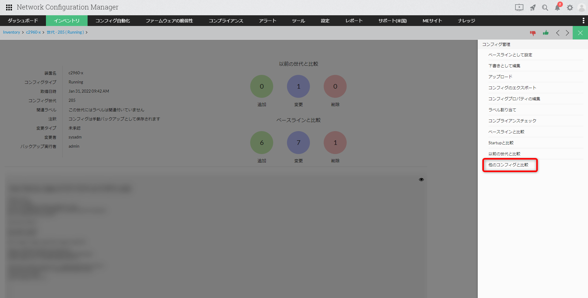 - 装置スナップショット画面から任意のコンフィグ世代を表示し、画面右上の[≡]から、[他のコンフィグとの比較]を選択します。