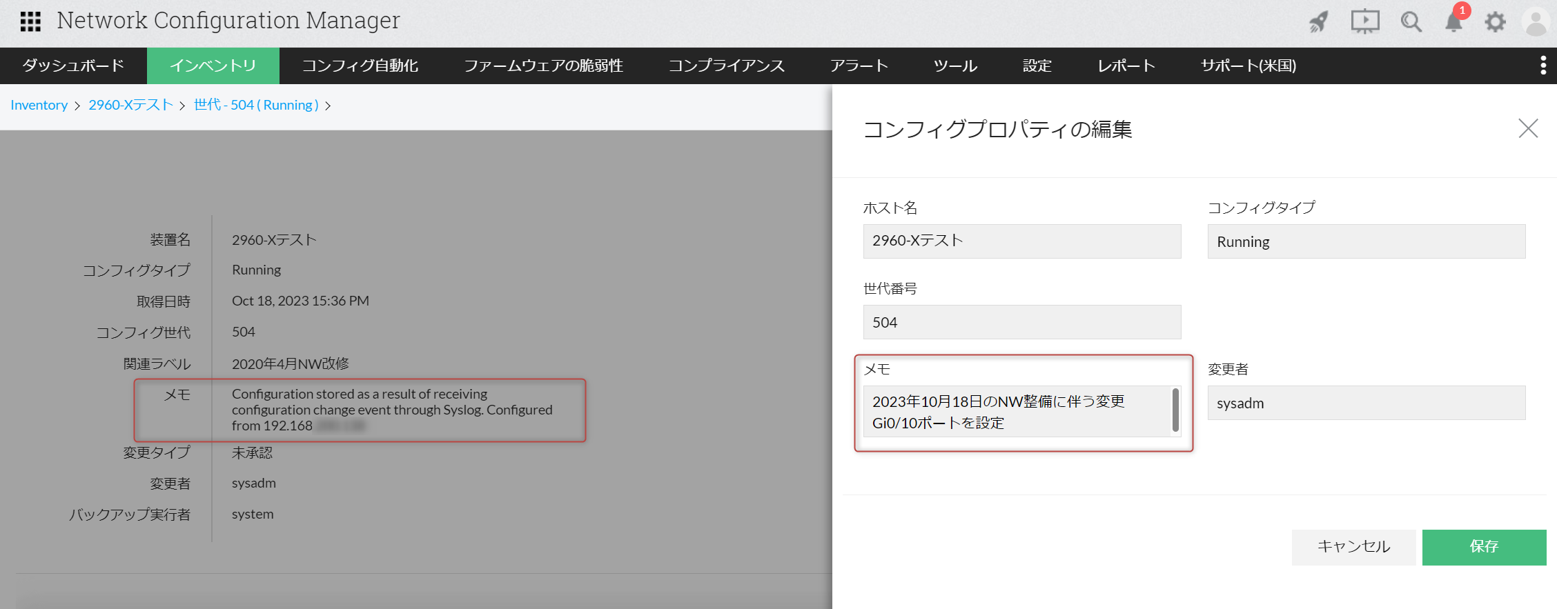 メモの内容は[コンフィグ変更へのメモ]レポートにも反映され、一覧で確認可能です。