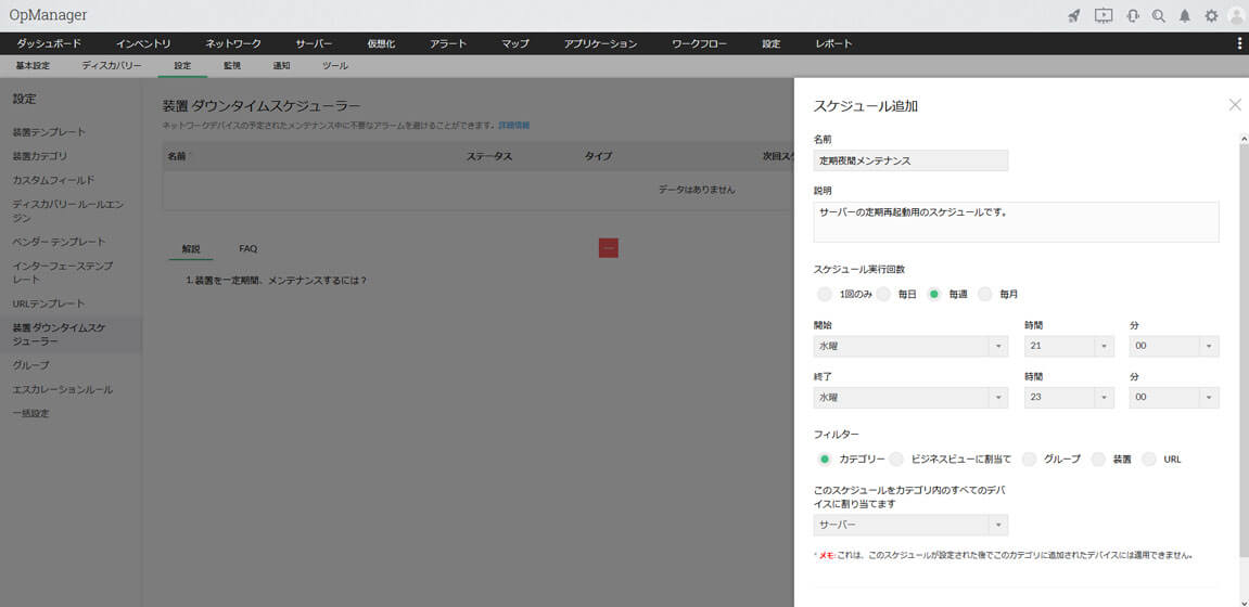 管理者は、一時的に装置を管理対象からはずすことができます。定期メンテナンスやアップデートで装置を停止する場合に役立ちます。 設定した時間が経過すると、装置のステータスは管理状態に戻り、障害発生時にはアラートを表示します。