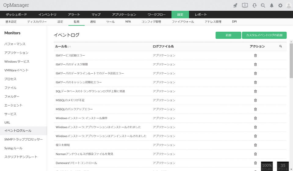 そのため、多くの管理者が必要な監視をツールで実現しています。ManageEngineが提供するOpManagerもそのひとつです。OpManagerのイベントログ監視機能には、ネットワーク内のWindowsサーバーとワークステーションすべての重要なセキュリティログを監視するための自動化ルールがデフォルトでセットされています。