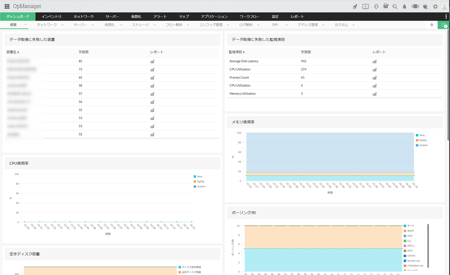 システムパフォーマンスダッシュボードは、OpManagerサーバー自身の監視状況およびリソースなどのパフォーマンス状態を表示するダッシュボードです。