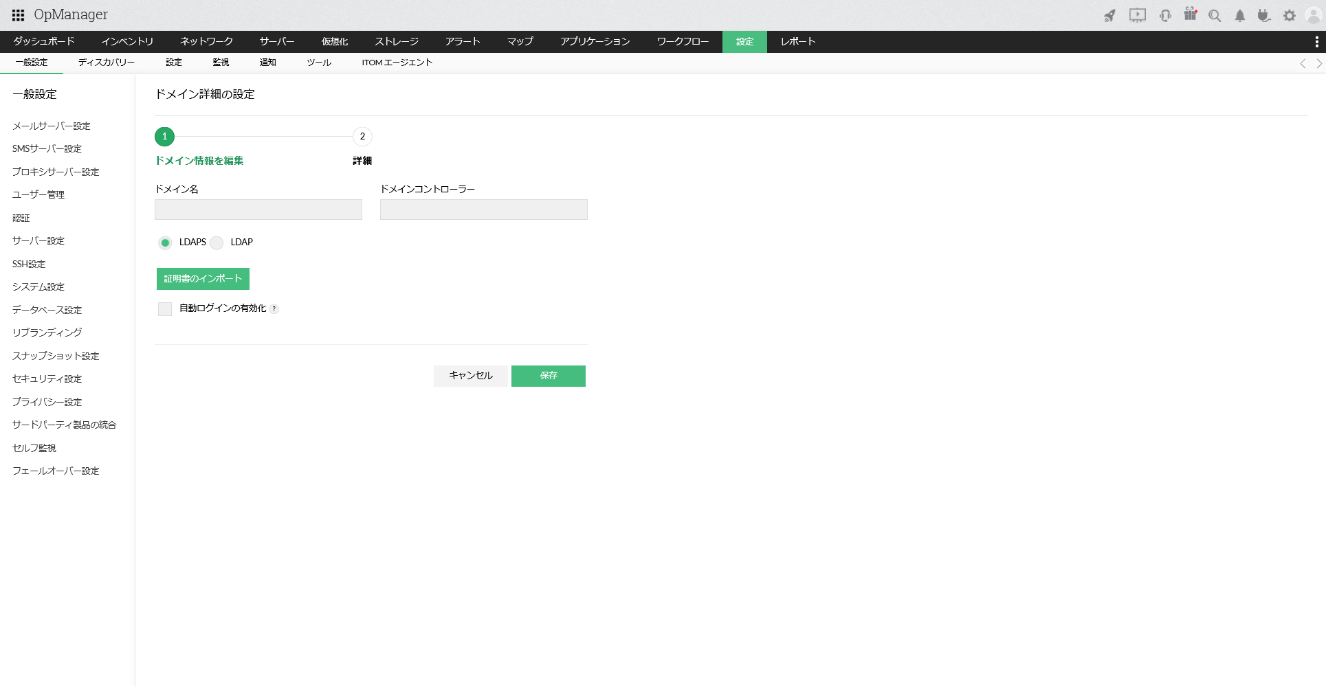 LDAPSを選択する場合は、続けて[証明書のインポート]から、ドメインに接続する際に必要な証明書をインポートします。自動ログインの有効化 有効にすると、事前にOpManagerでユーザーを追加せずに、ドメインに存在するユーザーでログインが可能になります。
