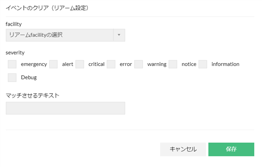 項目 説明 facility クリア基準とするsyslogのfacilityを選択します。 severity クリア基準とするsyslogのseverityを選択します。 マッチさせるテキスト クリア基準とするとするsyslogメッセージに対し、テキストマッチング形式で条件を指定します。