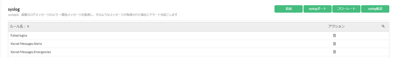 をクリックすることでsyslogルールの削除が可能です。