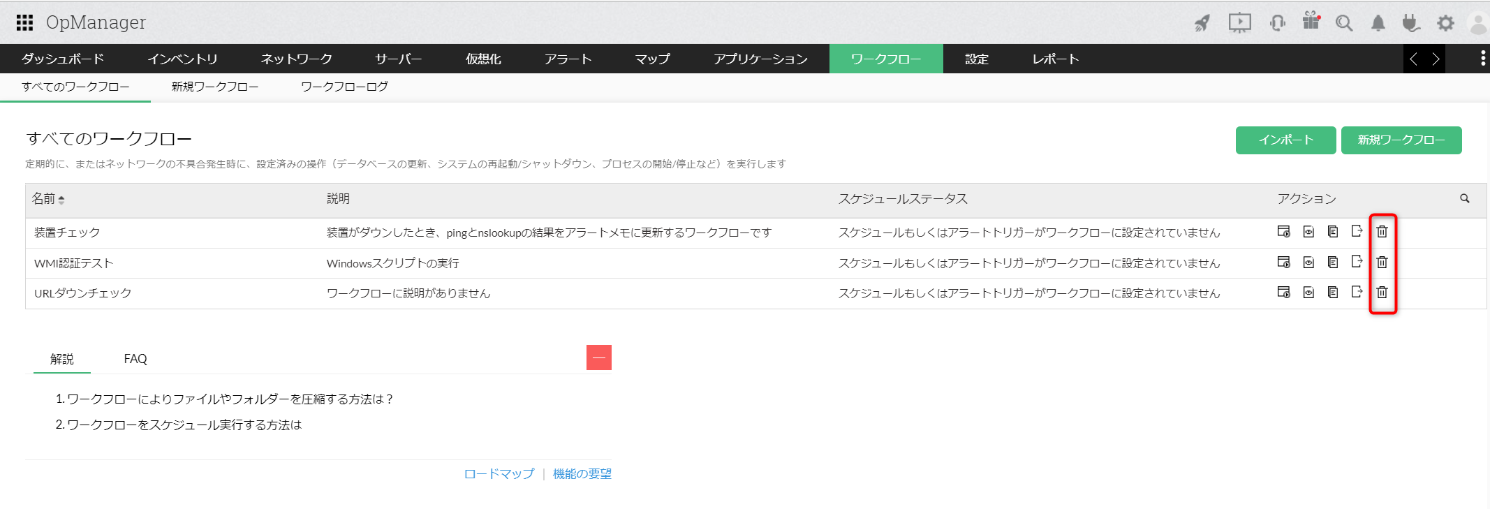削除するワークフローの[アクション]配下にあるゴミ箱アイコン