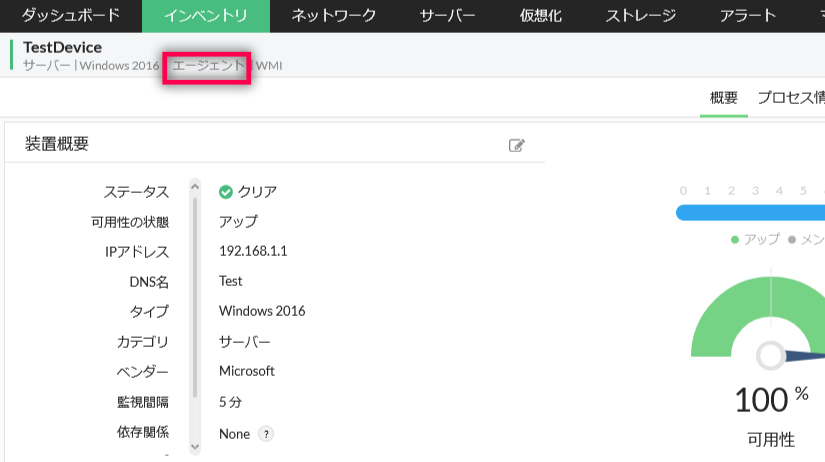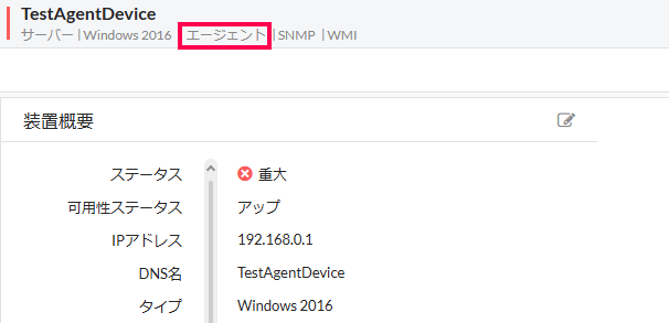 - [インベントリ]から対象装置の概要ページを開き、監視プロトコルが[エージェント]になっていることを確認します。